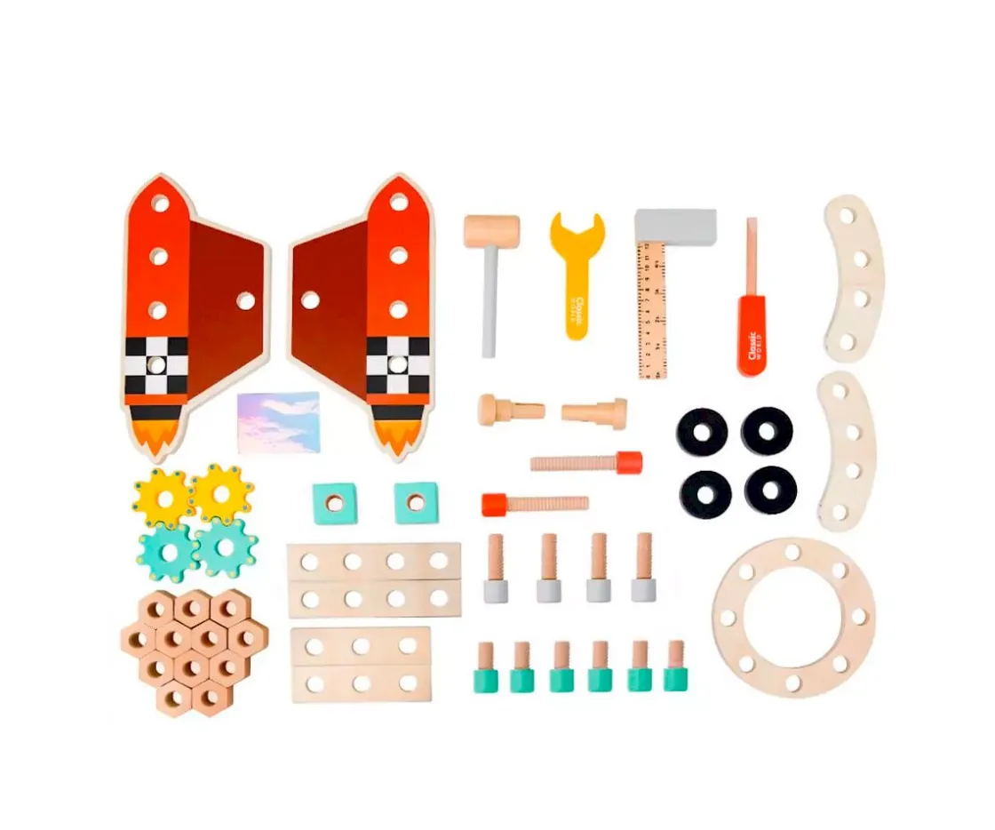 - Inlcuye 51 piezas : destornillador, llave inglesa, martillo, regla, tuercas, engranajes…