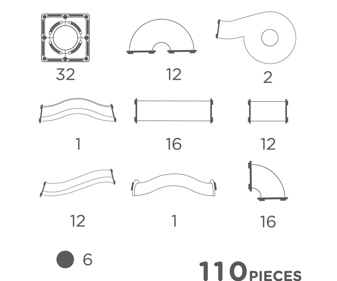 - Incluye: 2 ondas, 16 tubos rectos largos, 16 esquinas, 12 ondas, 12 tubos rectos cortos, 12 tubos en U, 32 cuadrados abiertos, 6 bolas y 2 tazones