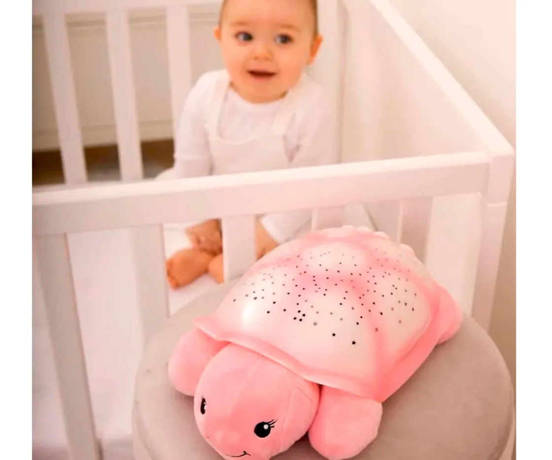 La tortuga planetario viene con 2 relajantes melodías y 100 estrellas que «parpadean». La tortuga proyecta varios patrones de estrellas de colores en el techo y crea un espectáculo de luces multicolor en el caparazón