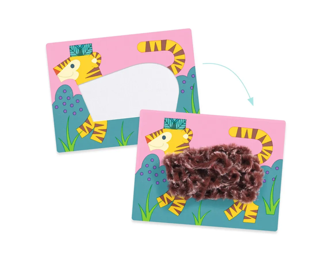 Djeco presenta esta actividad creativa tan suave como un peluche. Los niños colocan hilos de lana aterciopelados sobre zonas con velcro para dar forma al pelo de un adorable animal, ¡cada pelaje con un color distinto! Perfecta para estimular la creatividad y la motricidad fina mientras se divierten.