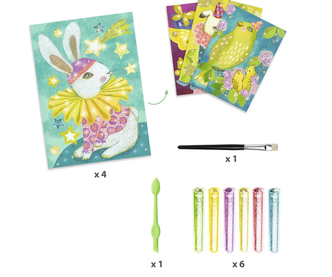 - Incluye 4 tarjetas impresas (medidas 15 x 21 cm) con adhesivo, 6 tubos de purpurina, 1 herramienta de plástico, 1 pincel brocha, instrucciones paso a paso a todo color.