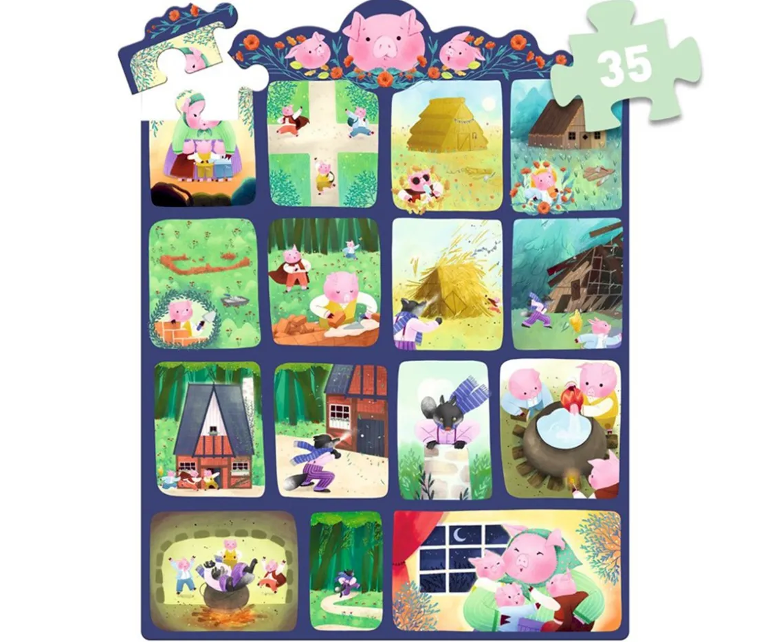 Con este puzzle de Djeco tu peque aprenderá nuevas habilidades de desarrollo y agilidad al mismos tiempo que revive cada una de las escenas del cuento de Los 3 Cerditos.