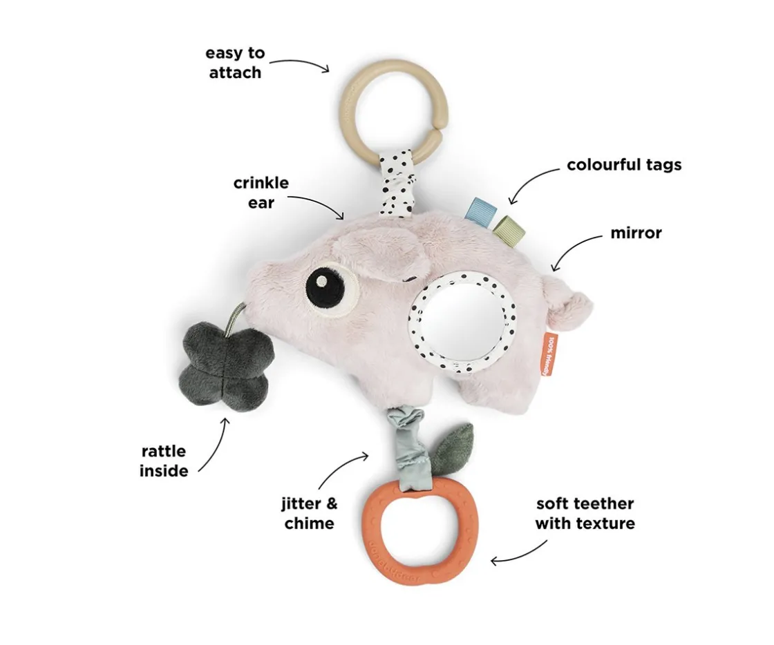 Podrás sujetarlo fácilmente con su anilla en la silla de paseo, en el cuco, en el cochecito, en el gimnasio infantil o en la cuna.