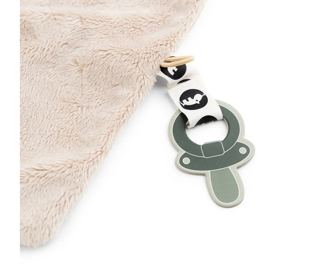 La mantita está llena de etiquetas divertidas y texturas emocionantes listas para ser exploradas y el clip de velcro mantendrá los chupetes cerca