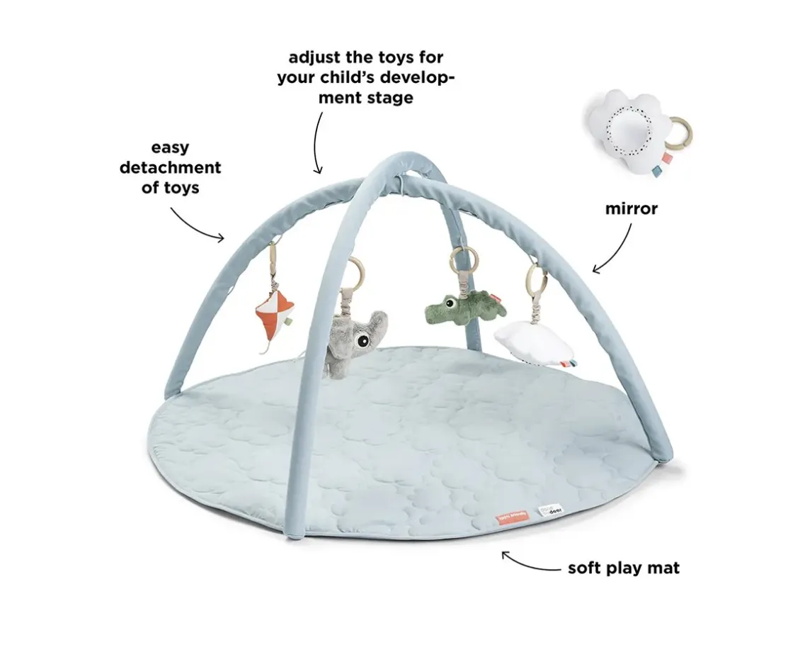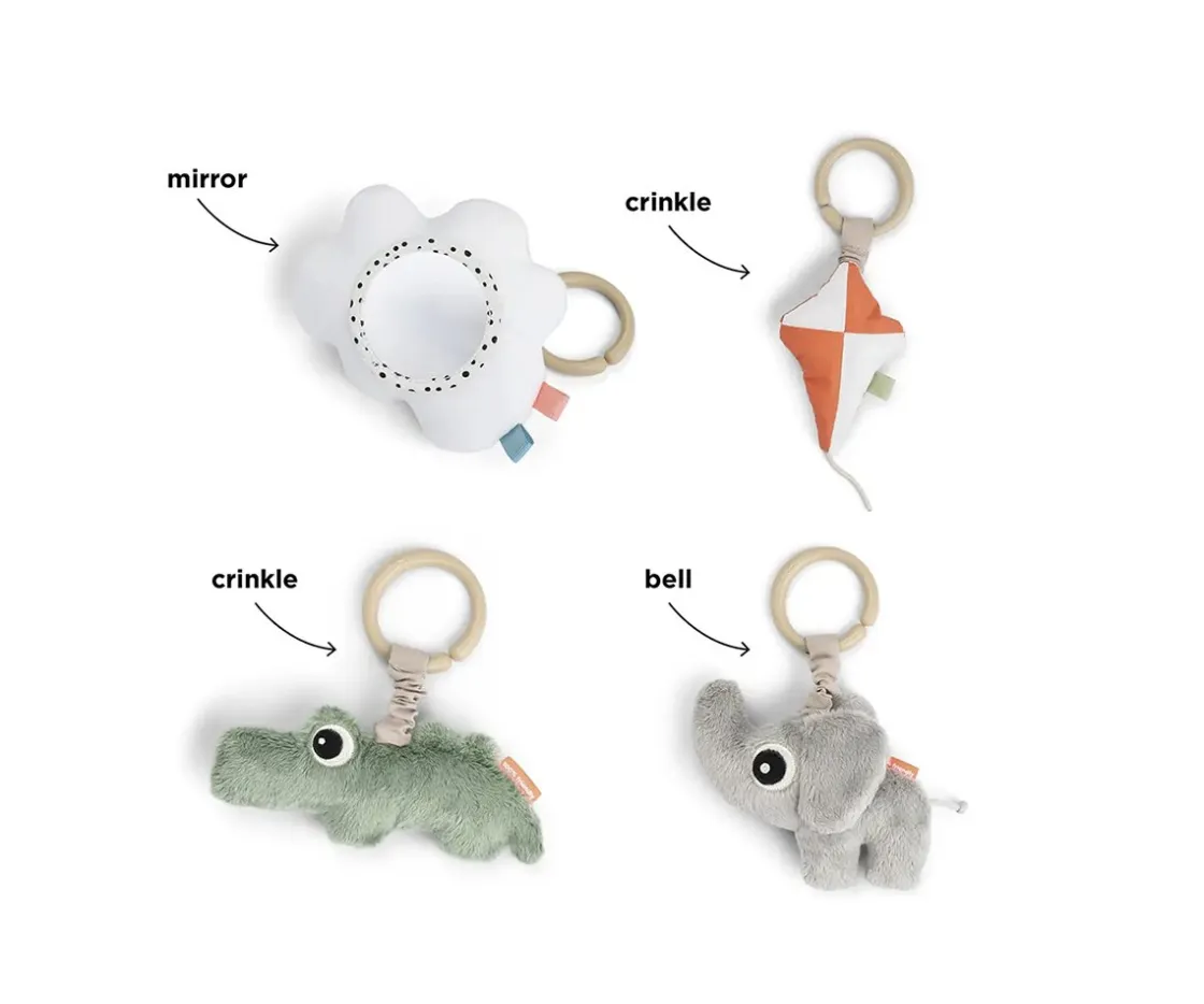 - Incluye 4 muñecos de actividades para el gimnasio (una nube, una cometa, un cocodrilo y un elefante)