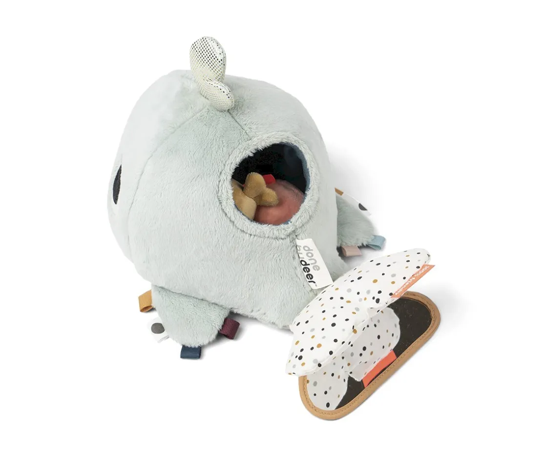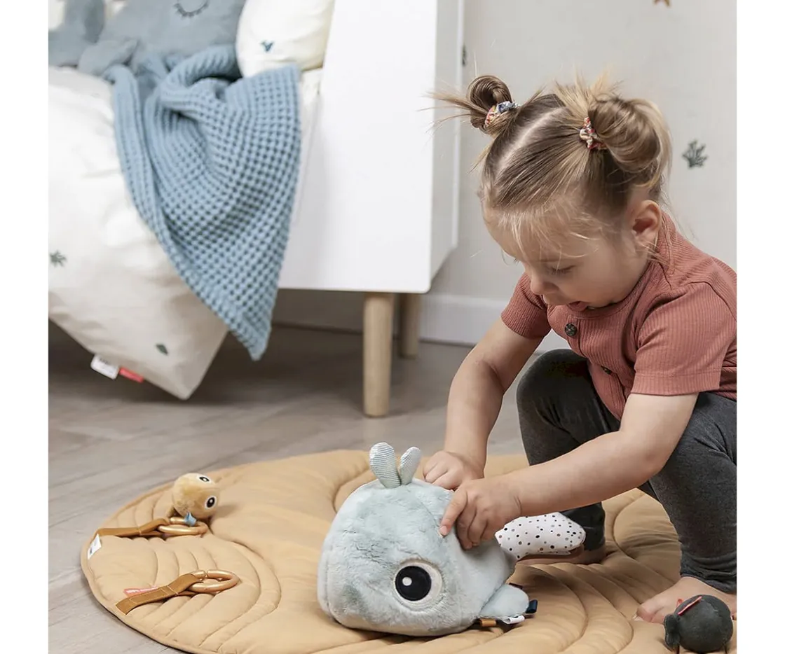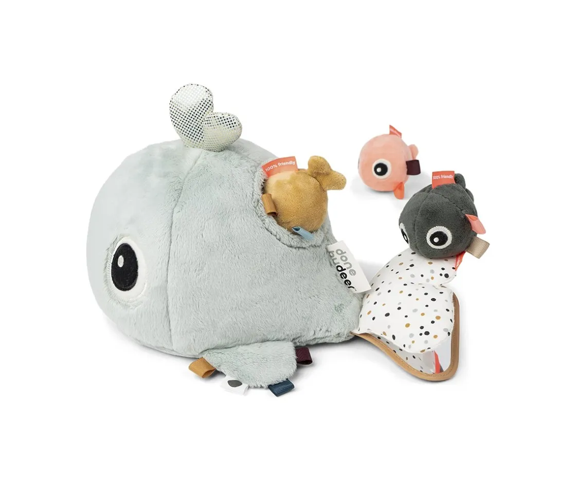 Wally y tres pequeños bebés pececitos con diferentes sonidos y texturas harán que tu peque estimule sus sentidos. Un juguete dónde desarrollará sus habilidades de concentración y coordinación mano – ojo. Los pececitos se pueden introducir en la barriga de esta bonita ballena, descubrirá un espejito en su aleta y sentirá las diferentes texturas que le rodea.