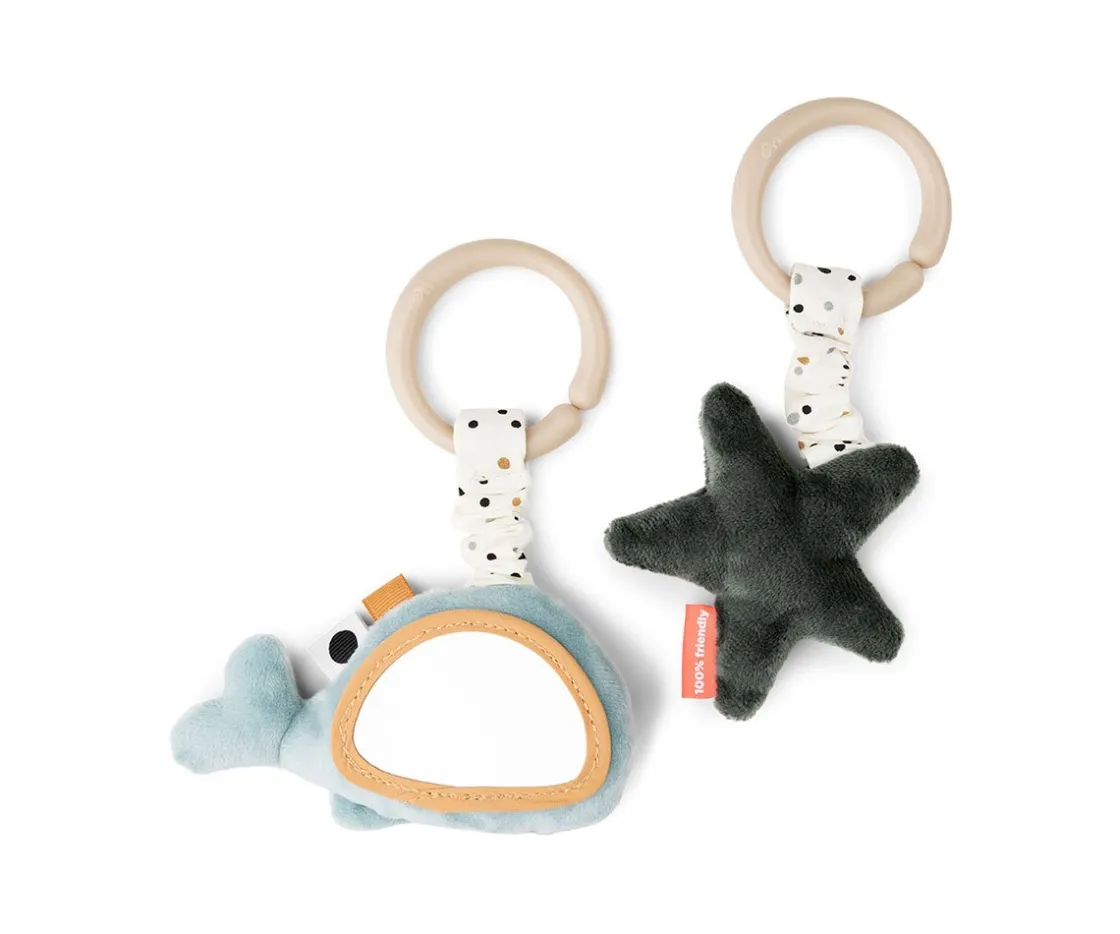 El suave Wally tiene un espejo y la preciosa estrella de mar con sonidos crujientes despertará la curiosidad de tu peque. Gracias a su tamaño son fáciles de agarrar por los más peques y son fáciles de colocar en la cuna o juguete de actividades con anilla.
