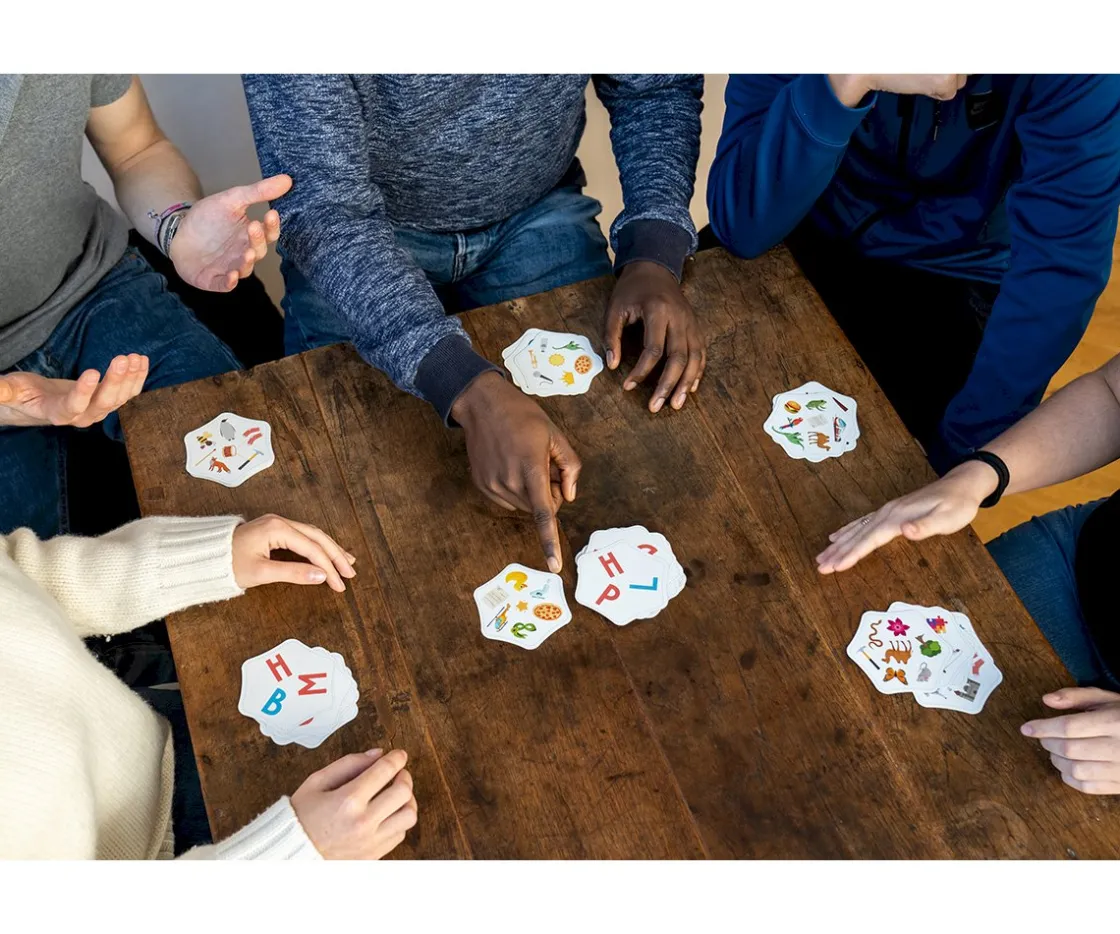 Se forma una pila en el centro de la mesa con todas las cartas con las letras hacia arriba. El primero en asociar una letra con un objeto, poner la mano en la carta y decir la palabra correctamente, se lleva la carta.