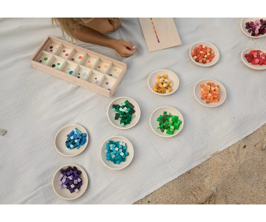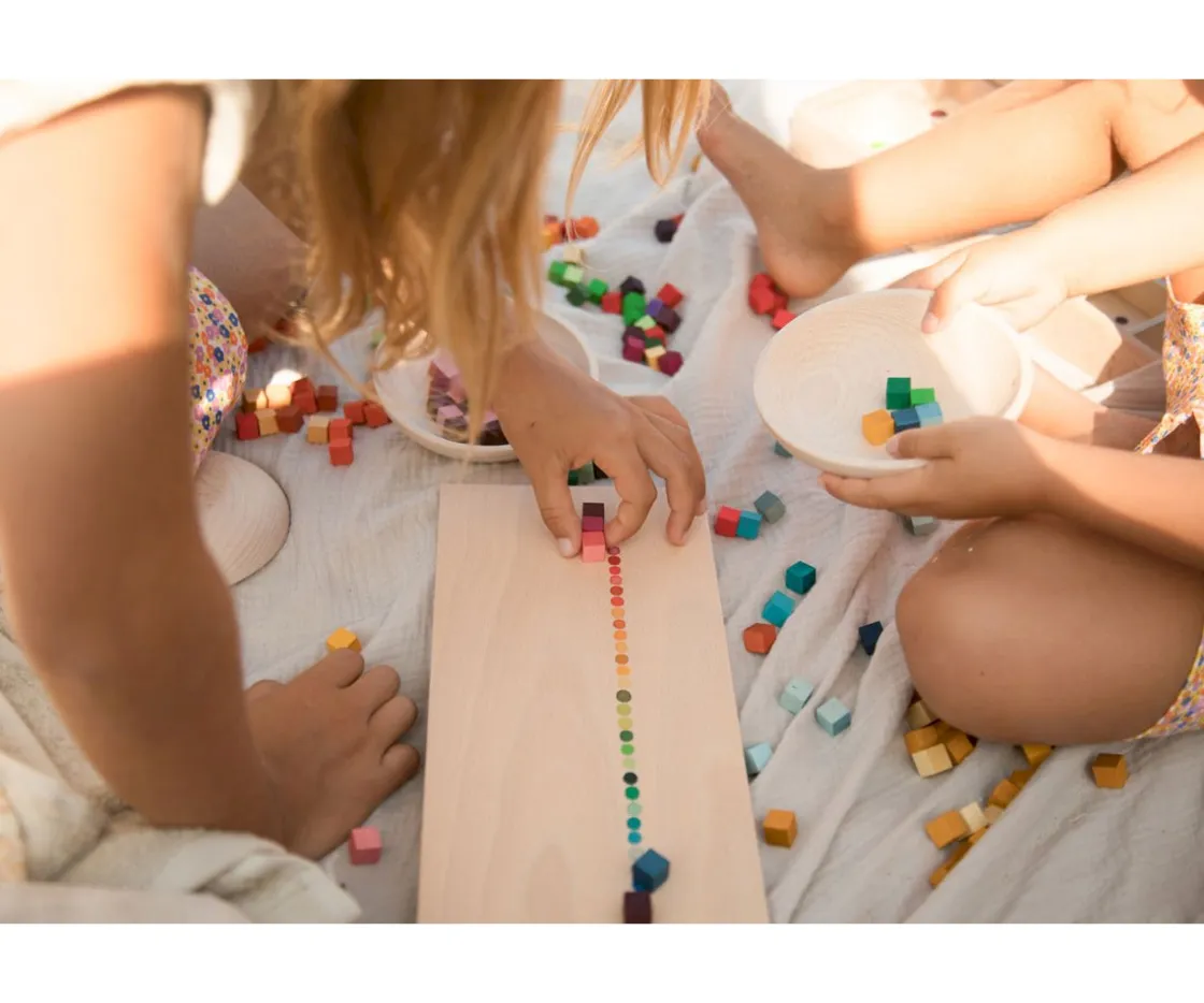 Mis and Match es una colección de cubos de colores en una caja clasificadora de madera.