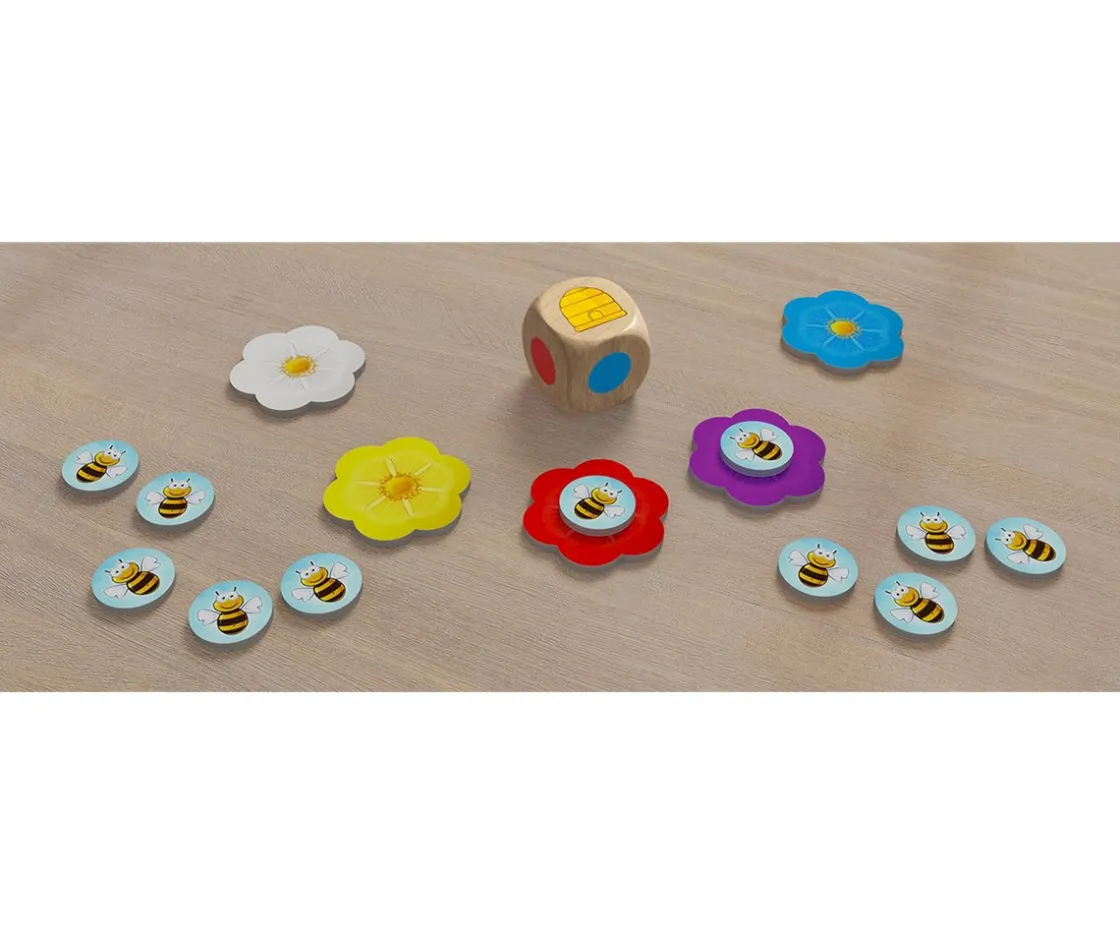 En este juego debemos lograr que todas nuestras abejas sean las primeras en volar hasta la colmena (el cubilete) o hasta las flores de colores. Para ello, por turnos se lanza el dado de colores y en función del color que toque, podremos desplazar una de nuestras abejas o deberemos dejarlas donde están.