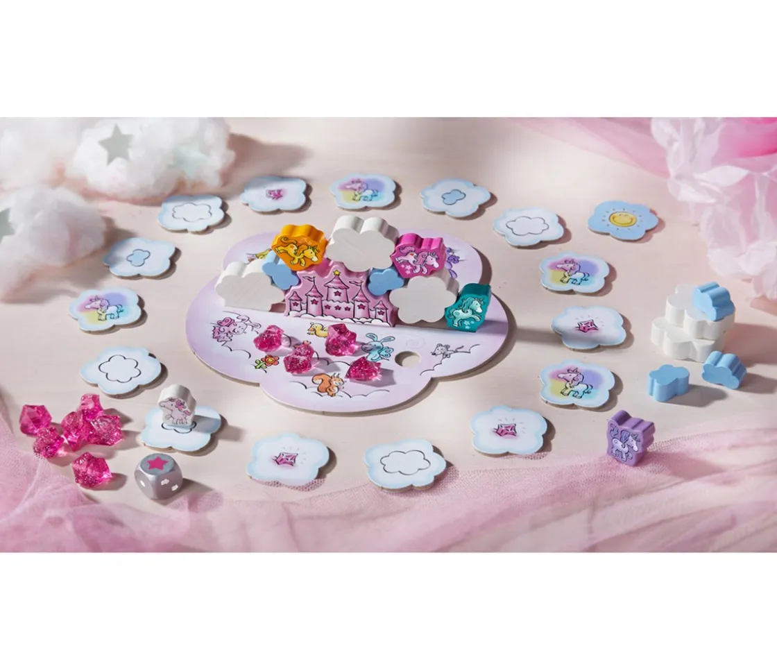 - Contiene: 4 unicornios: Destello (rosa), Polvo Interestelar (amarillo), Flor de las Maravillas (lila) y Vorágine Mágica (turquesa), 1 unicornio pequeño Rosalie (rosa), 1 castillo de nubes, 5 nubes blancas y 5 nubes de color azul de madera, 1 dado, 1 tablero en forma de nube, 16 fichas nube, 10 cristales de nubes e instrucciones de juego