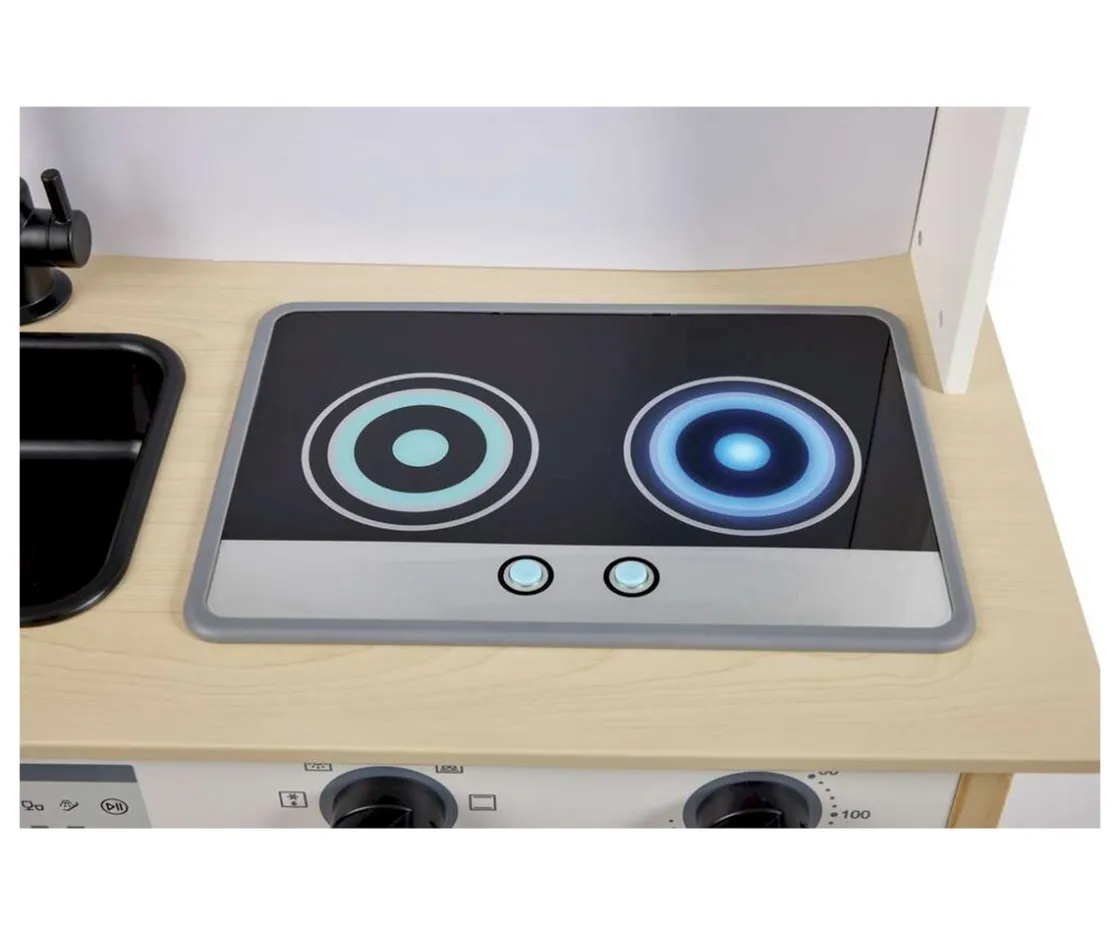 Entra en un mundo de creatividad culinaria con la cocina interactiva de Hape, llena de accesorios útiles, sonidos y luces realistas que se activan pasando la mano.