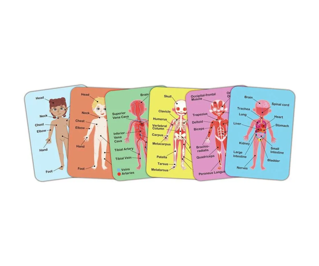 - Incluye 63 piezas, una base de pie de madera, un contorno del cuerpo con imanes del cuerpo de niño y niña, un esqueleto, un aparato circulatorio, un aparato muscular, un sistema nervioso con órganos y 6 tarjetas de doble cara del cuerpo humano