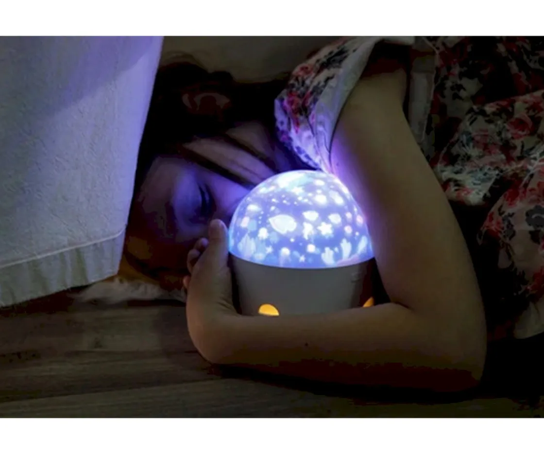 Preciosa lámpara proyector de luz GioStar en forma de casita que aportará una sensación cálida y relajante tanto a peques como a mayores. Con planetas giratorios, estrellas centelleantes y un ambiente marino misterioso, brinda seguridad y tranquilidad en las horas nocturnas. La suave música calma y ayuda a los pequeños a conciliar el sueño.