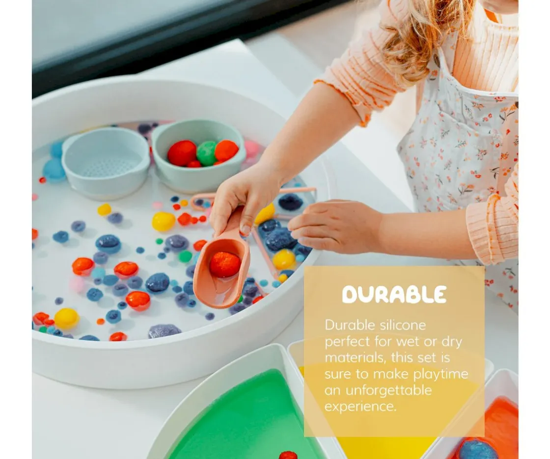 Diseñadas para que las manos de los peques las manipulen fácil y cómodamente, Inspire My Play presenta este set de 4 mini palas de silicona perfectas para el juego en arena, agua o para recoger y soltar materiales.