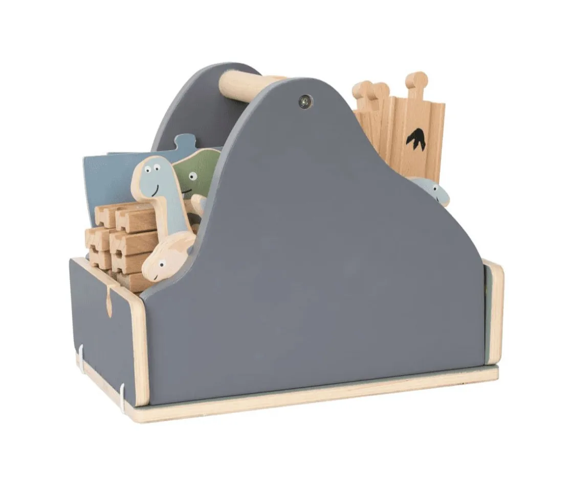 Cuando termines el recorrido, guarda los dinosaurios, las pistas y accesorios en la caja de madera transportadora. ¡Un juguete perfecto para disfrutar en casa o llevarlo a cualquier parte!