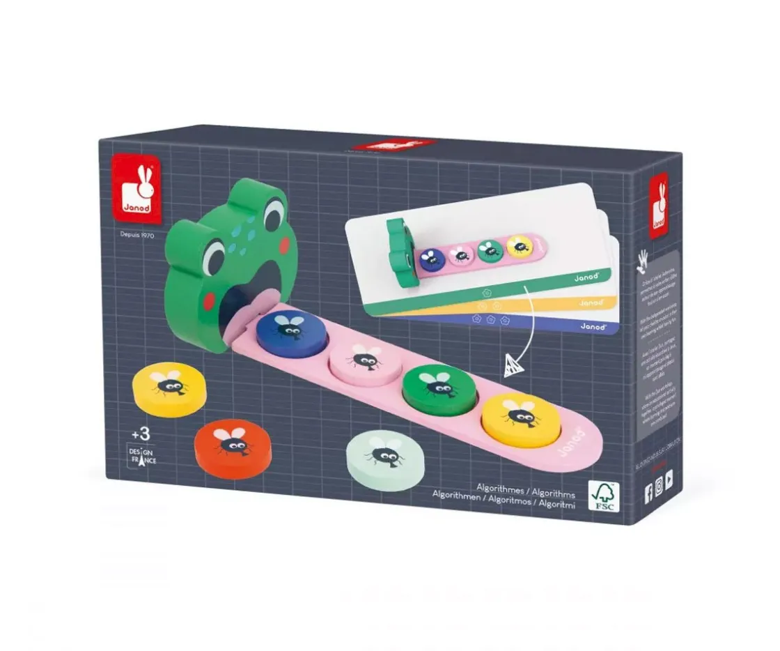 ¡A jugar y aprender con esta bonita rana glotona! Los peques se divertirán con las series lógicas y al mismo tiempo afianzarán lo que han aprendido en el cole y ejercitarán su agudeza visual. Gracias a este juego educativo, aprenderán a diferenciar los colores y a identificar una secuencia lógica. Tomando como ejemplo las 12 tarjetas de modelo por ambas caras, tendrá que reproducir una secuencia de colores.