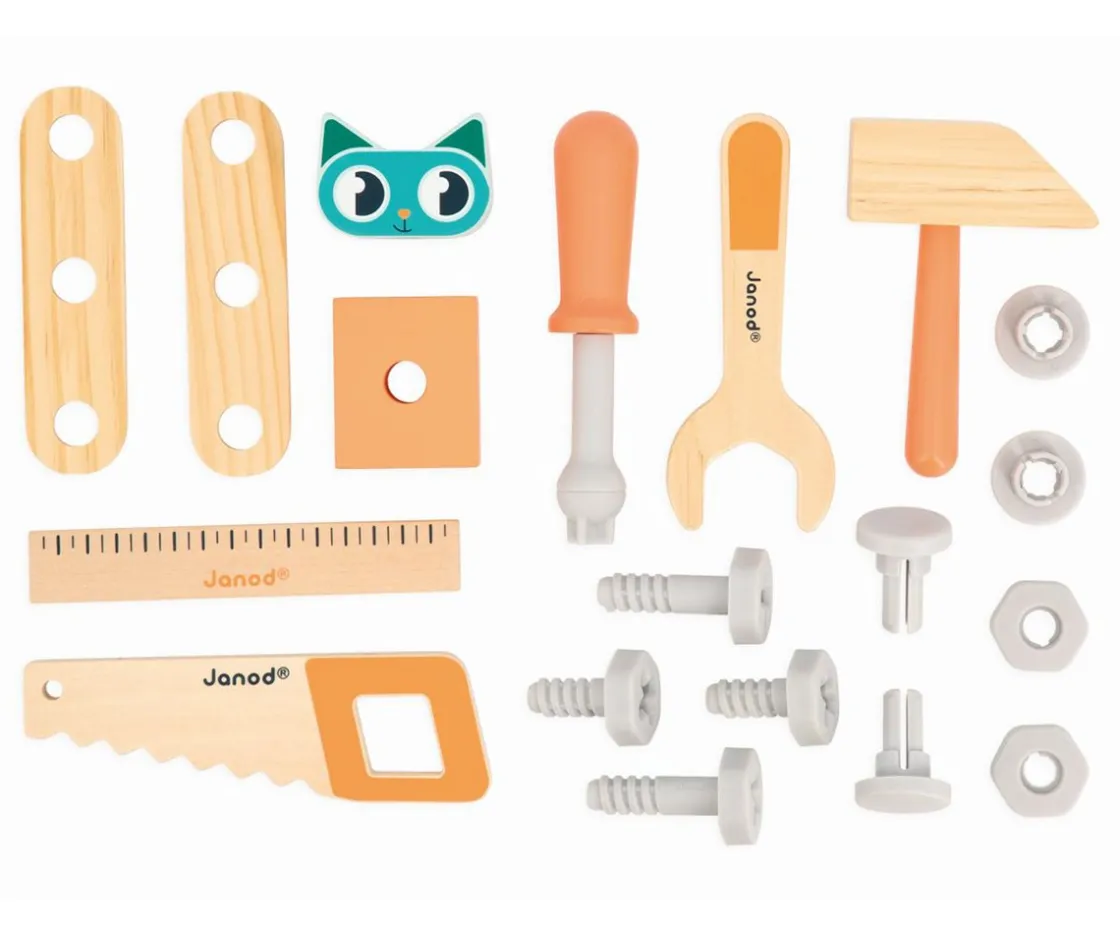 Este colorido camión de arrastre de madera de la colección Brico’Kids de Janod es perfecto para tu peque. Su remolque se eleva para dejar todas las herramientas y tornillos, permitiendo construir y crear.