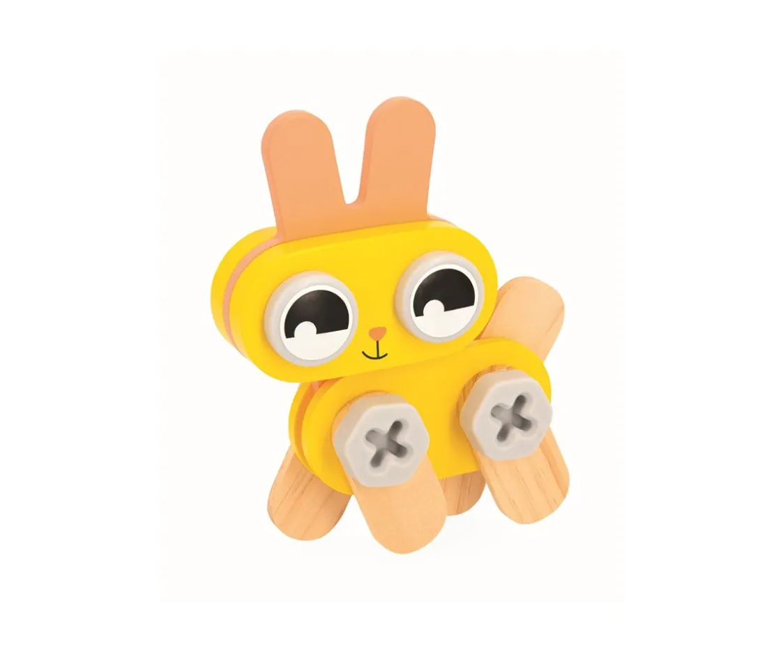 Con este set de Brico’Kids de Janod los peques se iniciarán en la construcción y el montaje de las piezas para poder construir pieza a pieza a un perrito, un gatito y un conejo.