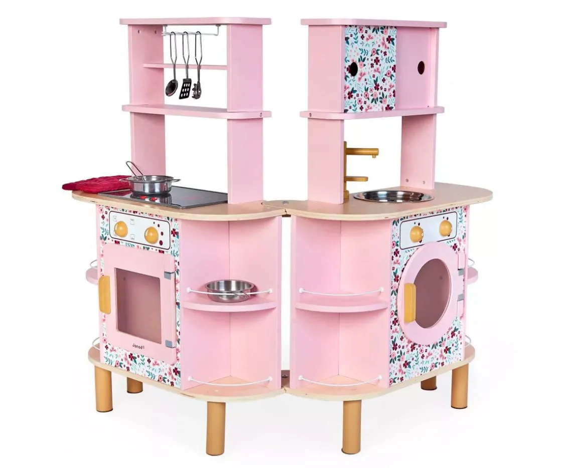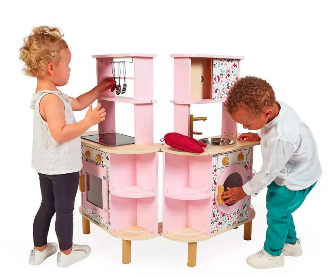¡Esta increíble cocinita de dos caras se abre por la mitad para descubrir lo que esconde en su interior y multiplicar las posibilidades de juego. Equipada con un fregadero de metal, un grifo de madera y una placa de inducción con luz y sonido. Solo hay que pulsar una vez los botones rojos para que se enciendan las placas y una segunda vez para oír el sonido del agua hirviendo. El sonido y la luz se apagan automáticamente al cabo de 30 segundos o al pulsar los botones por tercera vez. Encender el horno y la lavadora no podría ser más fácil: cada uno está equipado con dos botones giratorios con efectos sonoros. ¡Las puertas son magnéticas y la ventana transparente permite asegurarse de que la lavadora ha terminado!