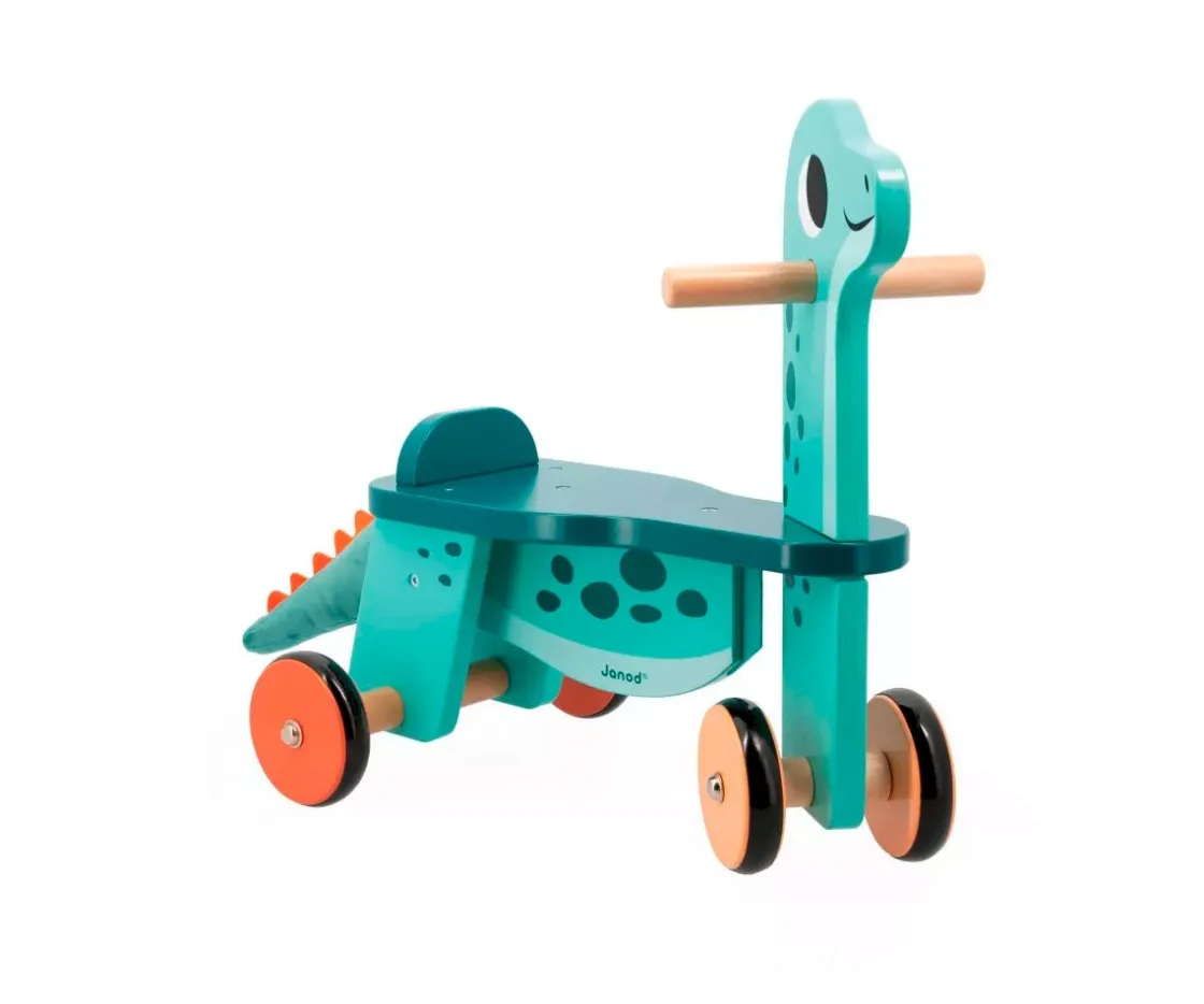 Las 2 ruedas delanteras se mueven con la cabeza del dinosaurio cuando los peques quieran girar.Las ruedas están revestidas de silicona, y el asiento de 21 cm de altura les permite subir al correpasillos fácilmente.Las asas del manillar son de madera natural y la cola es de peluche.