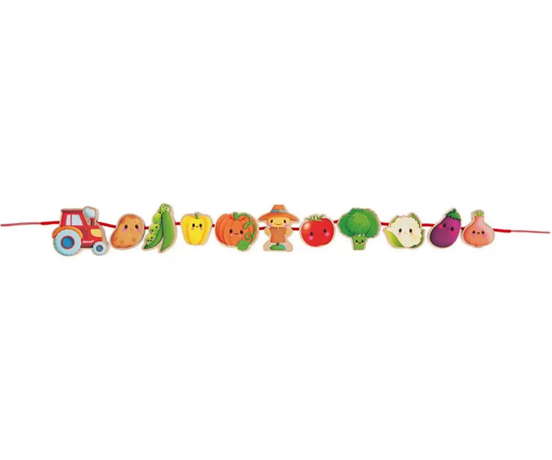 Divertido juego de enhebrar cuentas de madera inspiradas en la granja para poder desarrollar la motricidad fina mientras se divierten. ¡Ayuda al tractor a recoger todas las verduras de la huerta! Incluye 11 piezas de madera (9 verduras, 1 tractor y 1 espantapájaros) y 2 cordones con puntas rígidas para facilitar el enhebrado.
