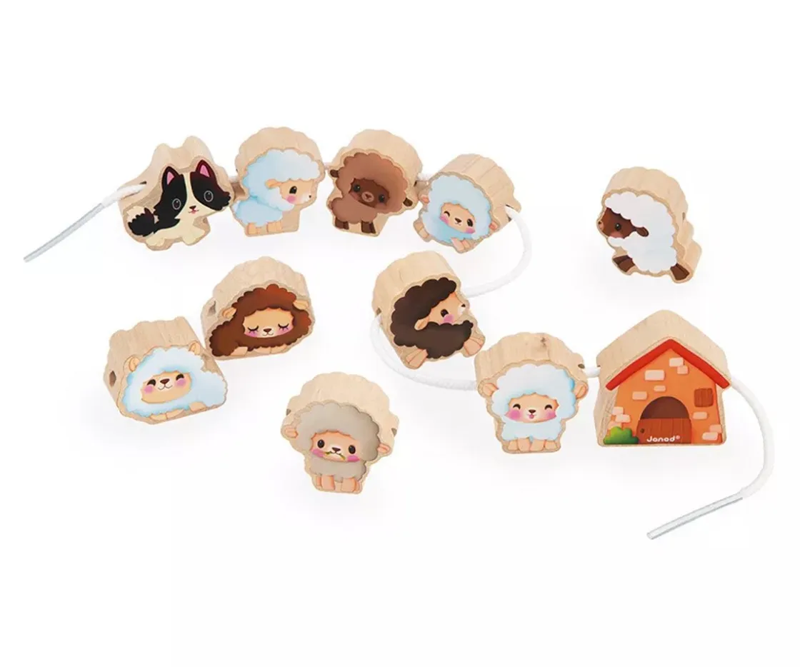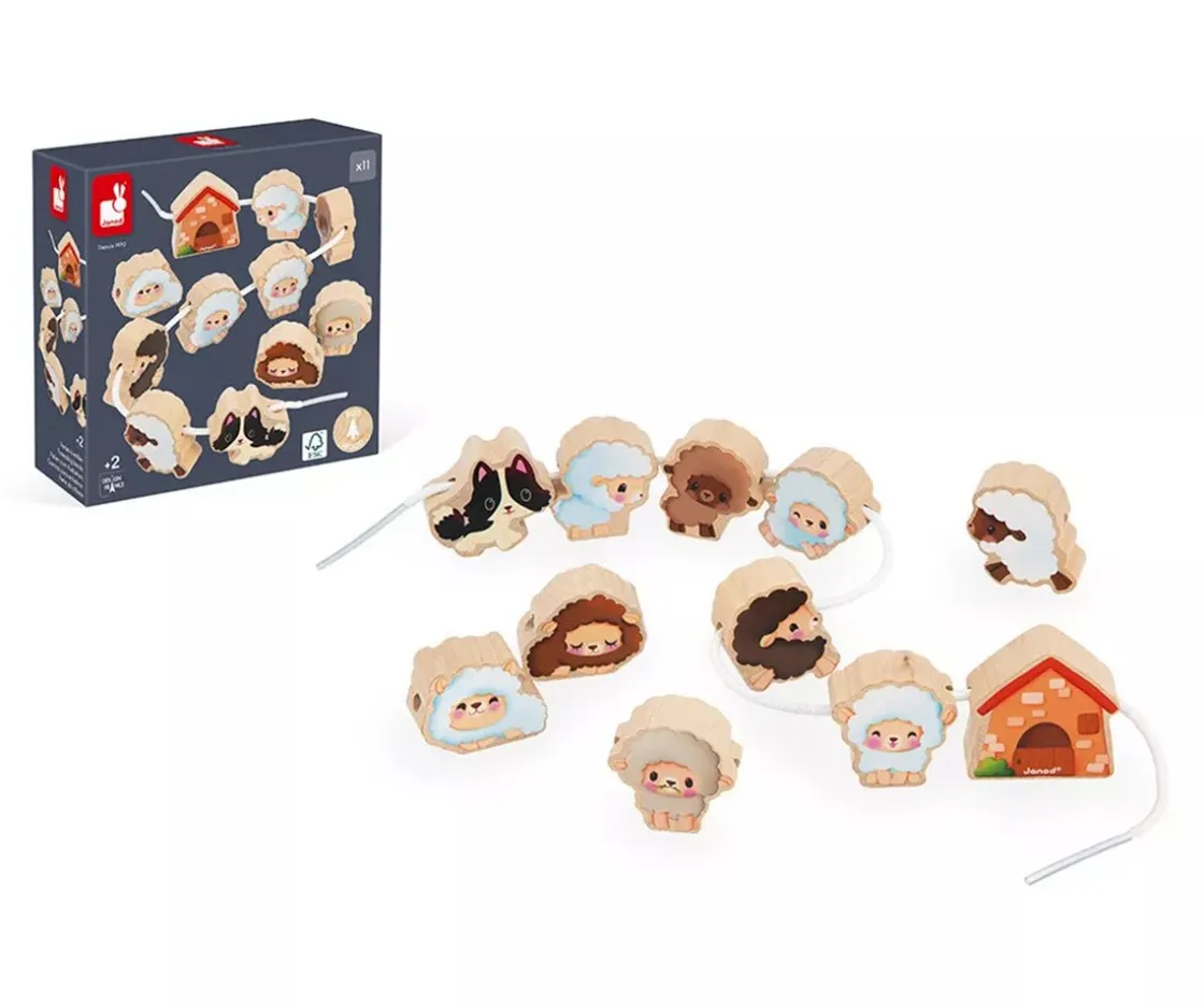 Divertido juego de enhebrar cuentas de madera inspiradas en la granja para poder desarrollar la motricidad fina mientras se divierten. ¡Ayuda al perro pastor a guiar a las ovejas hasta el cercado! Incluye 11 piezas de madera (9 ovejas, 1 perro y 1 casita) y 2 cordones con puntas rígidas para facilitar el enhebrado.