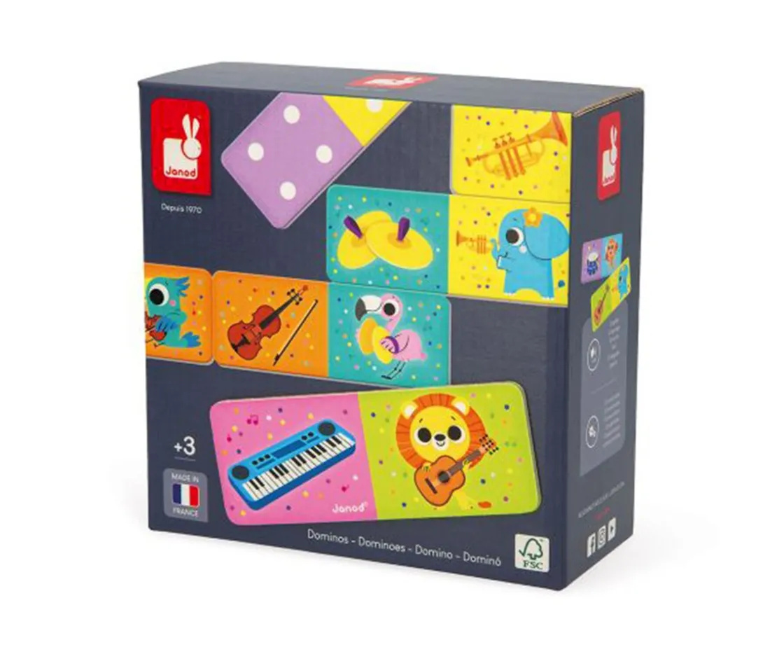 ¡Este dominó de Janod es súper divertido para que los peques aprendan sobre instrumentos y animales de la jungla! Las ilustraciones coloridas y reversibles animarán a los peques a unirlas y jugar imitando los sonidos y los animales.