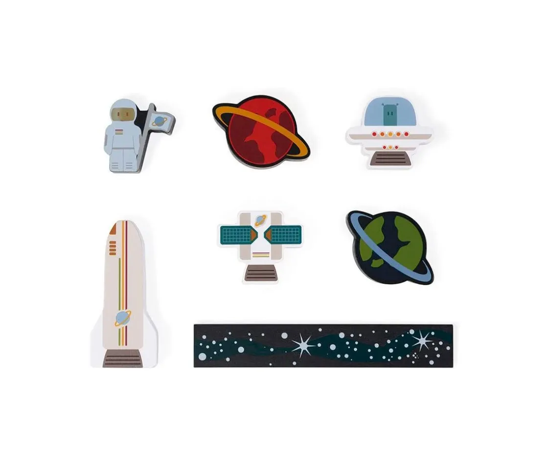 - Contiene 36 piezas: 5 cosmonautas, 5 satélites, 4 cohetes, 5 planetas, 5 ovnis, 12 tableros de «galaxias»