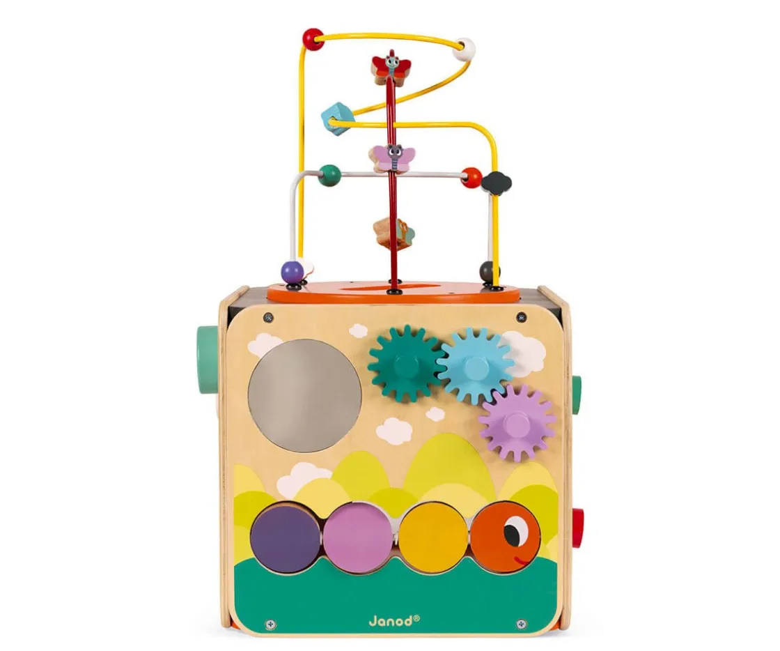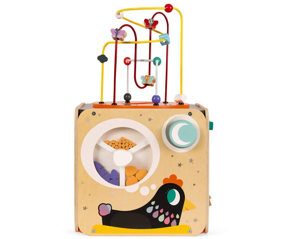 Este juguete de aprendizaje temprano está compuesto por una cara sonora con un molino lleno de huevos de madera de diferentes tamaños, otra cara con un engranaje de tres ruedas, un espejo y una oruga. Incluye también un laberinto, cinco piezas de encajar y un looping.