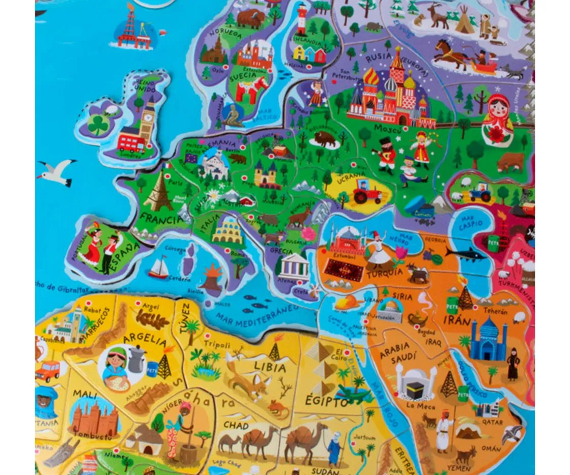 - Cada pieza magnética representa un país o una región del mundo con su nombre, su capital y una ilustración que lo caracteriza