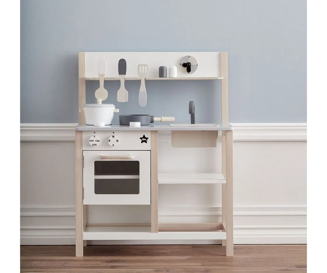viene con muchos accesorios como reloj, ollas, sartenes, puerta del horno que se puede abrir, fregadero y cucharones.