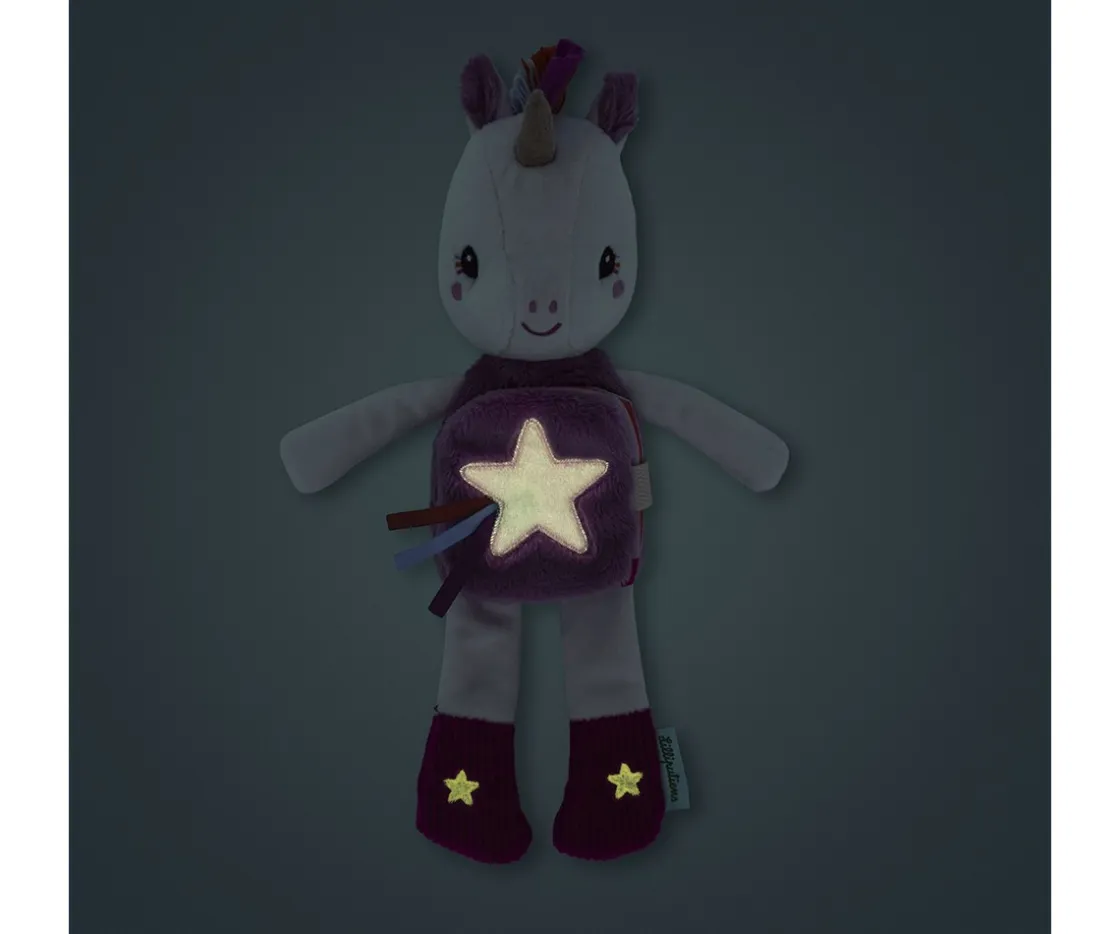 Lena, el unicornio suave y achuchable de Lilliputiens, esconde en su barriga un libro ilustrado que cuenta el ritual de la hora de dormir. Cuando se apaga la luz, las estrellas brillan suavemente para tranquilizar y velar por los dulces sueños.