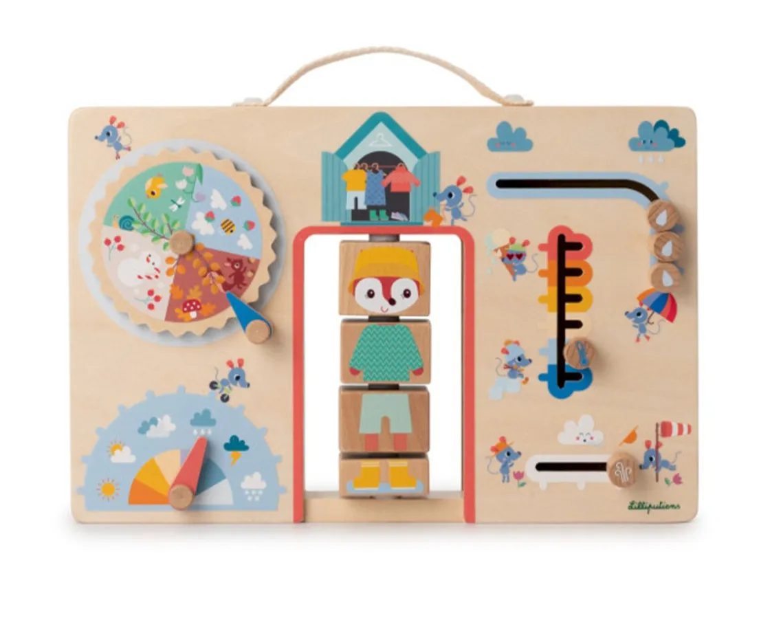 Con esta bonita maleta de Lilliputiens, los peques aprenderán sobre las 4 estaciones, cómo vestir a Alice según el clima: frío, calor, viento o lluvia. Tendrán que ir indicando la intensidad de lluvia, de sol y en qué estación nos encontramos.