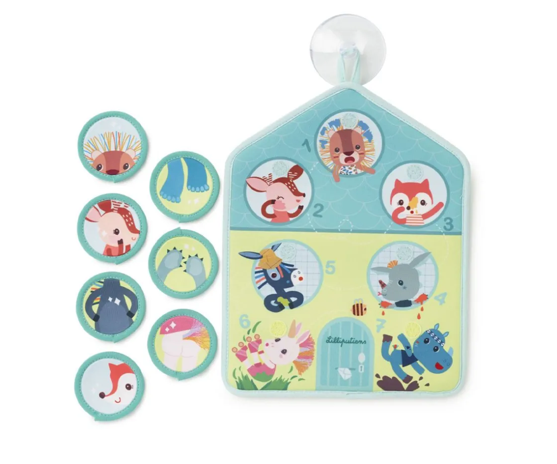Con este divertido panel de baño, la hora del baño se convierte en un momento de aprendizaje. Se fija fácilmente a la pared con ventosa e incluye personajes de Lilliputiens que necesitan un buen lavado. Los discos de neopreno representan partes del cuerpo y flotan en el agua, el niño debe encontrar el disco correcto para cada parte sucia y colocarla en su lugar.
