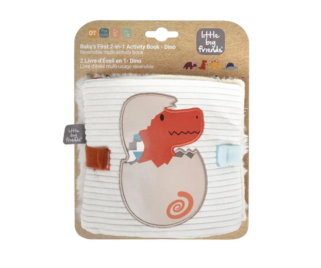 Libro de actividades 2 en 1 de Little Big Friends. Un libro blandito, con mucho color y diferentes actividades en su interior. Tiene dos lados, en el frente incluye: ilustraciones con temática de dinosaurios en colores. En la parte posterior: actividades con cuerdas para agarrar, mordedores, telas suaves o crujientes y un espejito sensorial.