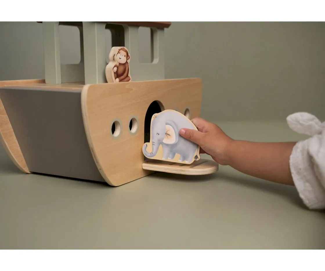 Ayuda a los animales a encontrar a sus parejas y prepáralos para el viaje. Incluye el arca con una puerta y una pasarela desmontable, además de Noé, su esposa y una gran variedad de animales en parejas: palomas, gallina, gallo, tortugas, monos, leones, avestruces, tigres, vacas, toros, osos polares, cocodrilos, jirafas, cebras, elefantes y camellos.