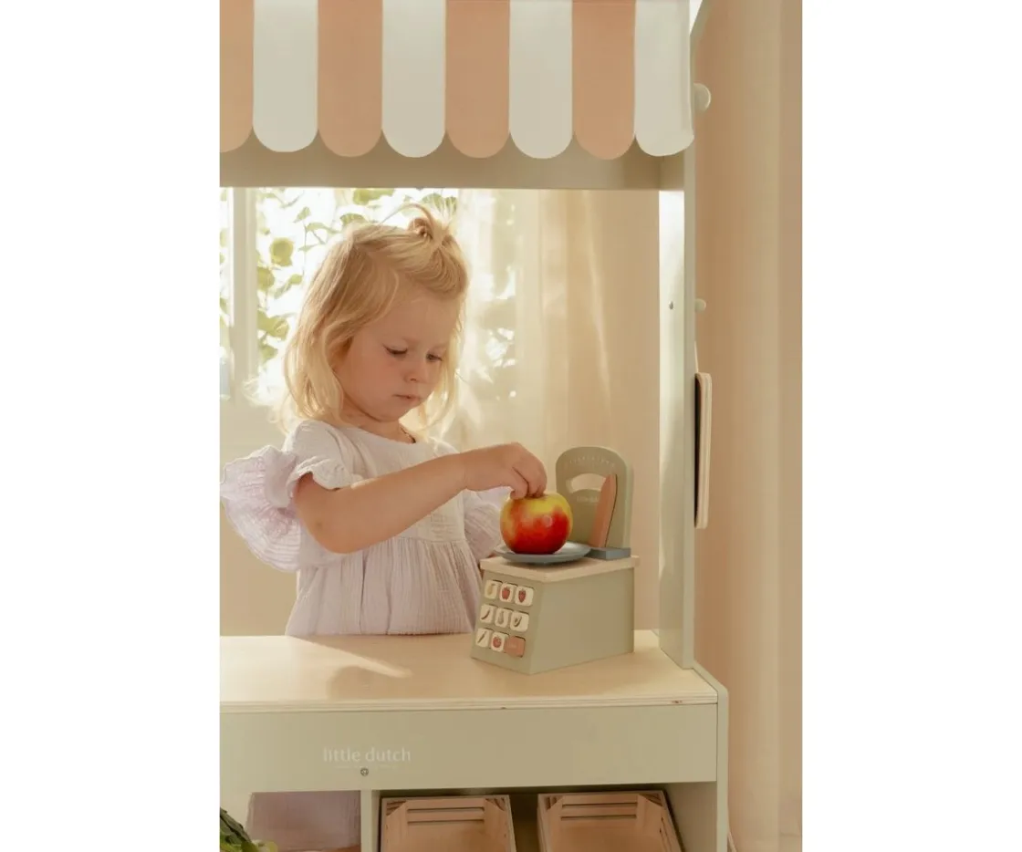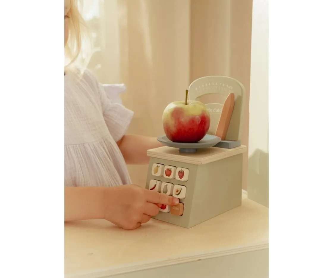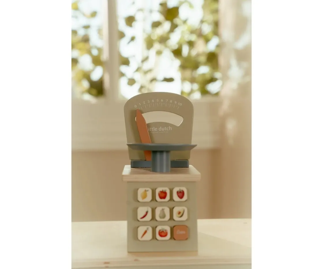 La báscula de madera FSC de Little Dutch permite a los peques pesar sus ingredientes con precisión mientras juegan. La aguja móvil muestra el peso real, y los botones con divertidas ilustraciones hacen que el juego sea aún más auténtico y educativo.