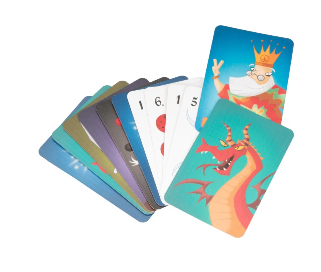 2. Puedes jugar: un Rey, un Caballero, un Dragón, somnífero, varita mágica o un bufón. También puedes tirar cartas de números. Jugando tus cartas tienes que intentar despertar a las Reinas.