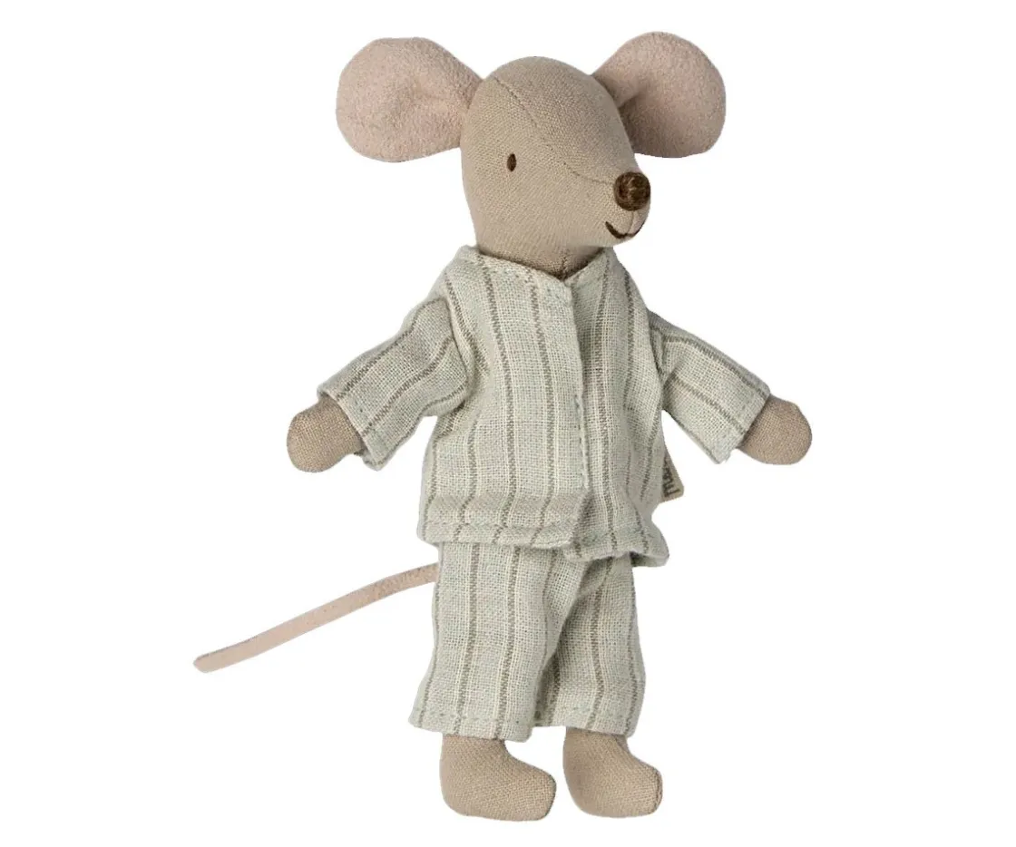 Este ratón esta listo para horas de juego. Duerme en una cajita de cerillas y lleva puesto un orginal pijama de rayas.