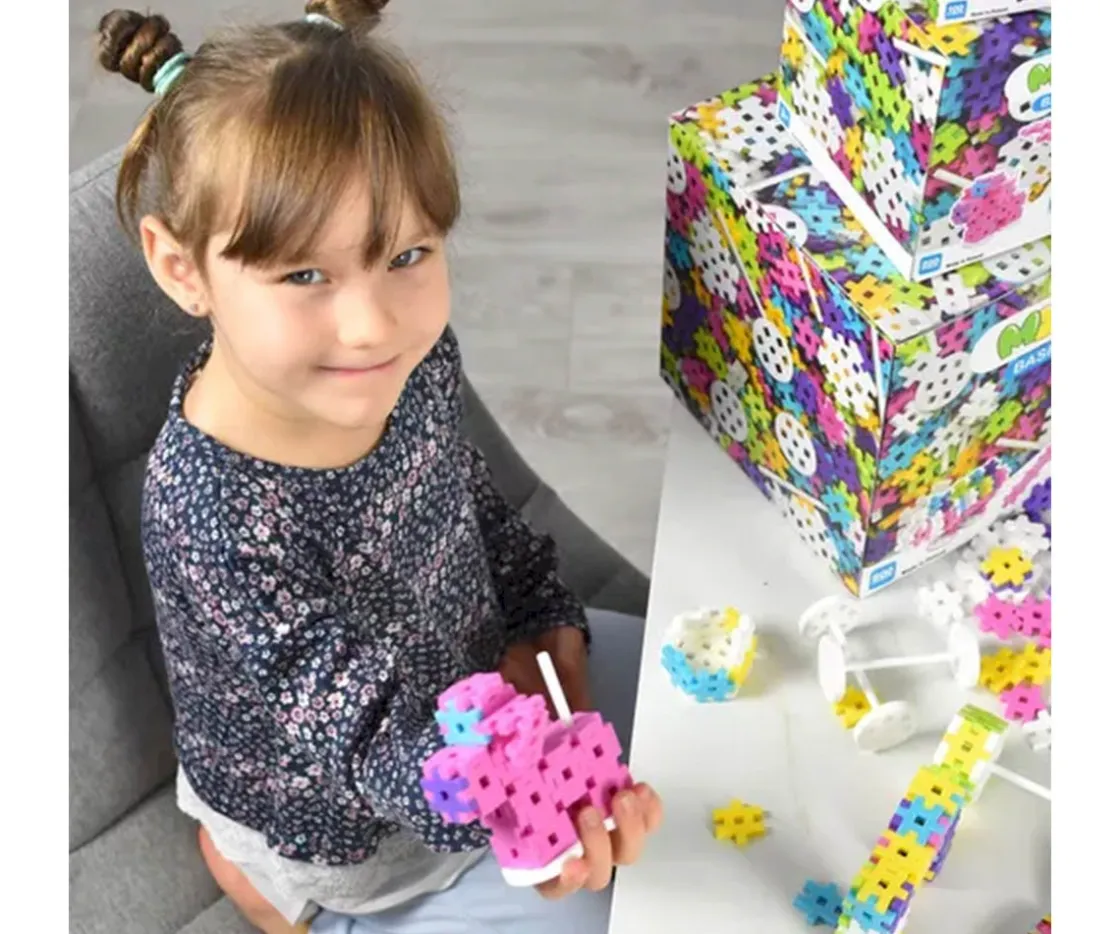 Meli 200 Piezas Constructor Pastel contiene 180 piezas básicas y 20 elementos para modelos especiales, como vehículos, en tonos pastel, especialmente en rosa.