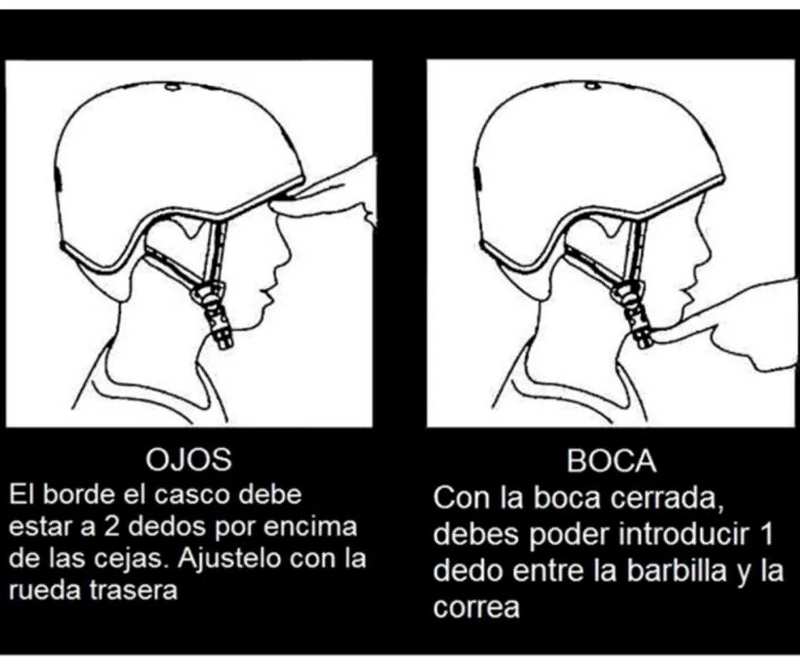 - El borde del casco debe estar a 2 dedos por encima de las cejas. Ajústelo con la rueda trasera
