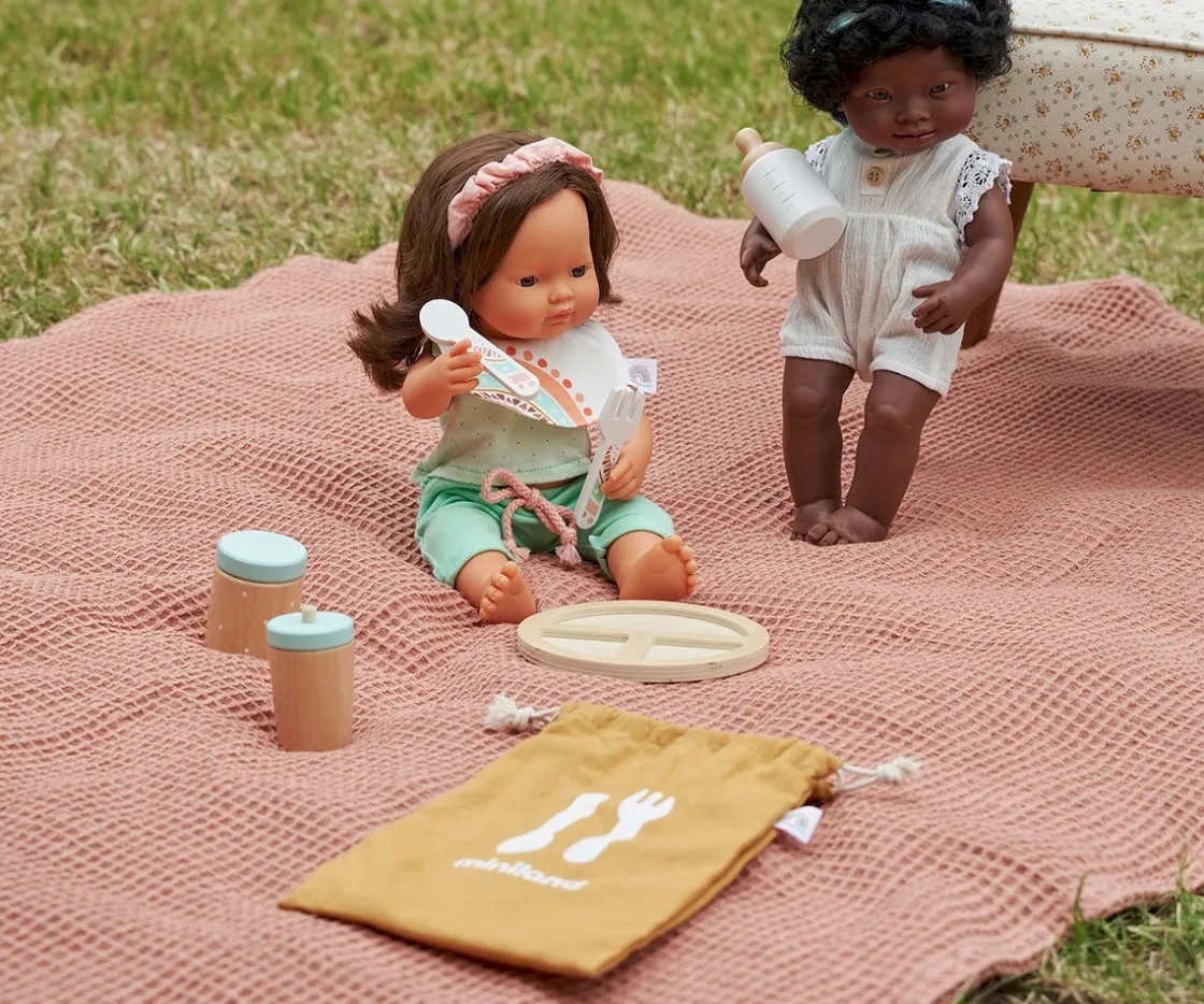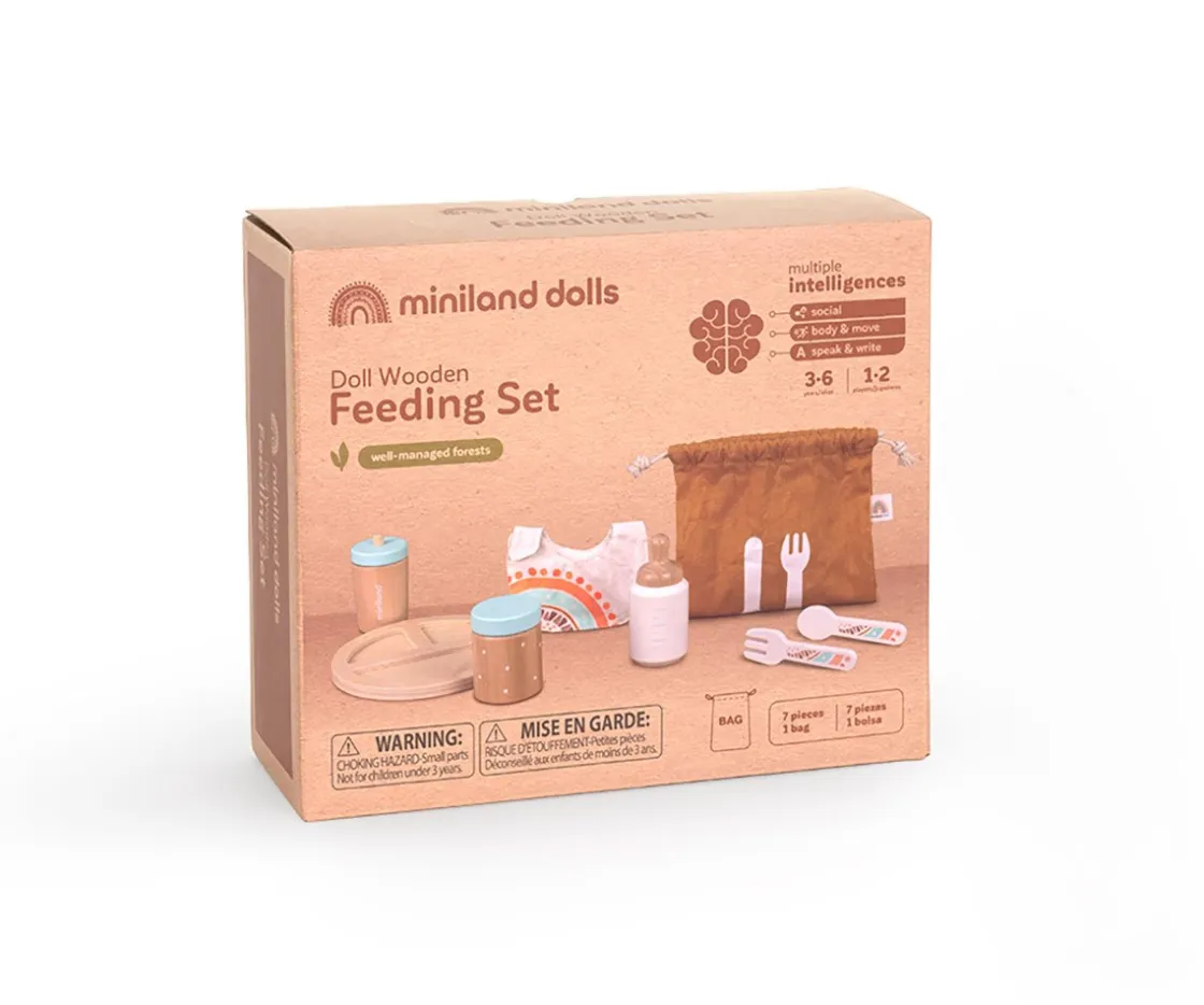 Incluye biberón, platito, biberón con pajita, bote de leche en polvo, cuchara, tenedor y una bolsita de tela para transportar y guardar todas las piezas.