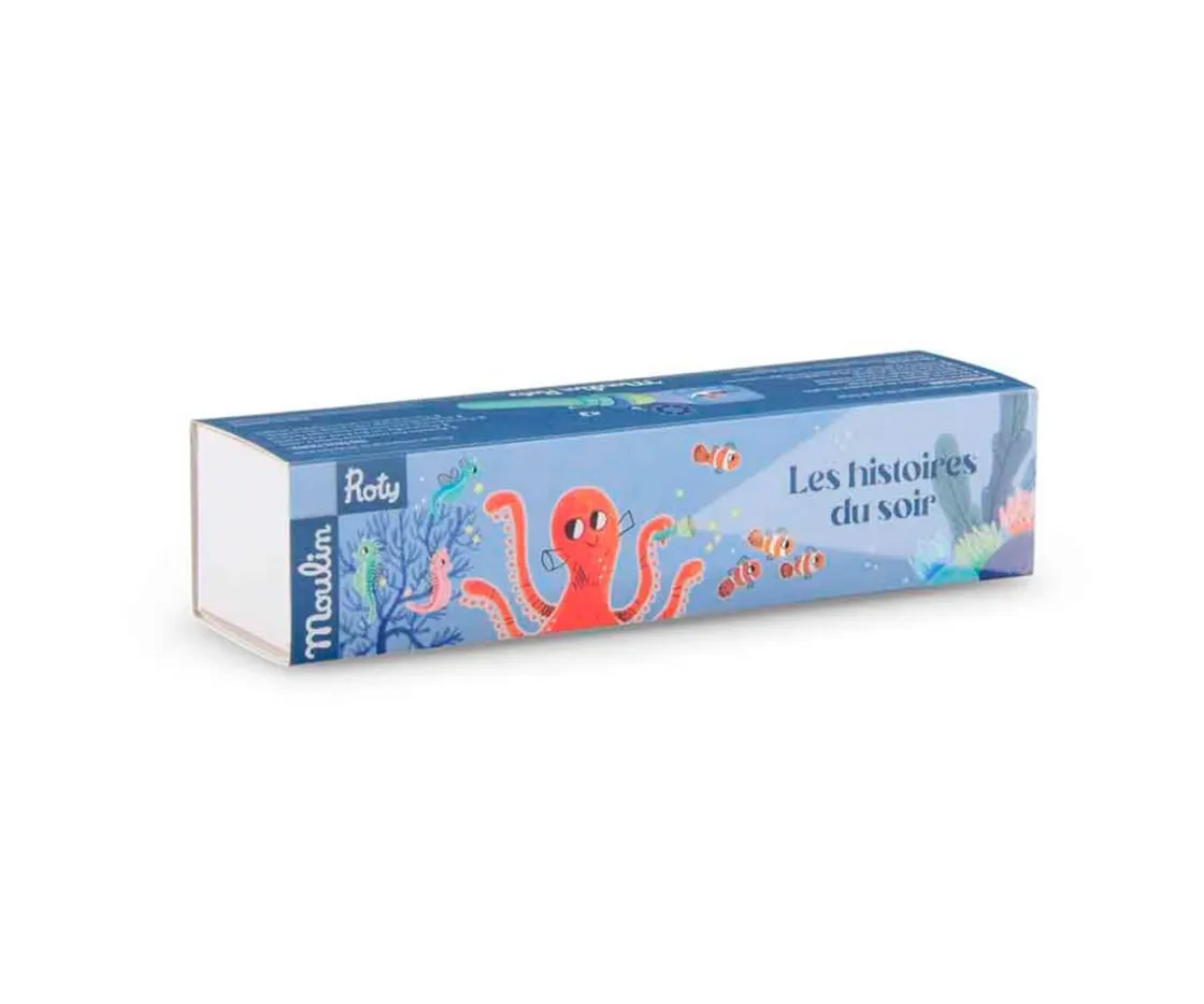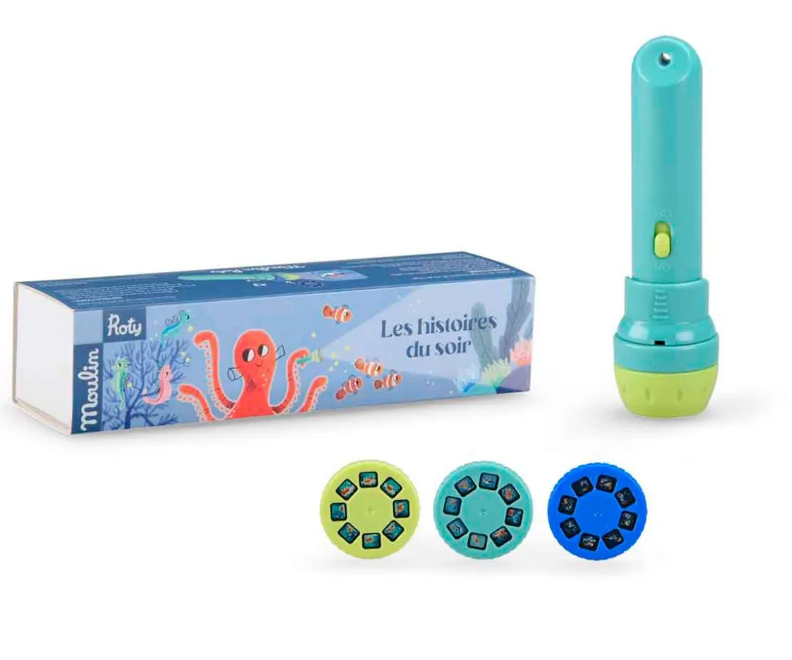 Se compone de una pequeña linterna (lleva las pilas incluidas) a la que se le pueden insertar tres ruedas con diferentes imágenes, de temática relacionada con el el mar («Los amigos de Paulie» «Tony el cangrejo» Paseo nocturno»»). Las preciosas ilustraciones proyectadas en la pared, el techo o en cualquier otra superficie, nos darán pie para inventar cuantas historias queramos.