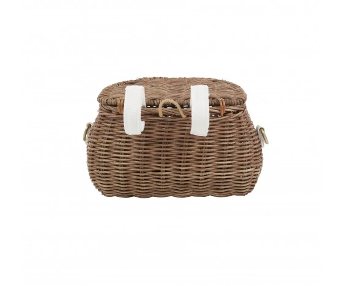 Tejido a mano de ratán con una pequeña tapa, con trabillas de lona regulables (para ponerlas a patinetes o bicicletas) y una correa larga ajustabe con herrajes de latón para llevar colgado.