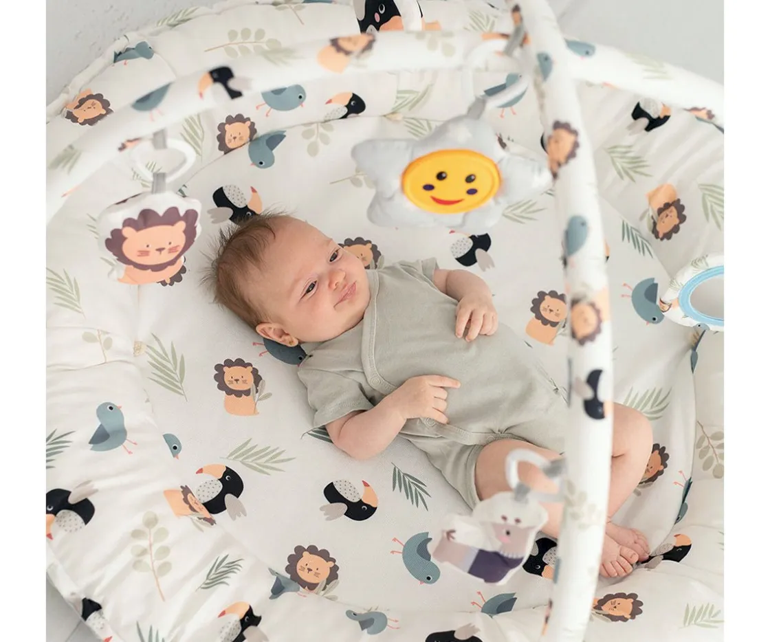 La alfombra de actividades Lion de Olmitos, es reversible, con arcos y ha sido diseñada para acompañar a tu pequeño desde sus primeros días. Además de estimular el desarrollo motor, visual y cognitivo; también proporciona un espacio acogedor y seguro gracias a sus laterales acolchados. Con los arcos y juguetes colgantes, tu bebé podrá disfrutar de una zona de juegos que le permita descubrir nuevas habilidades.