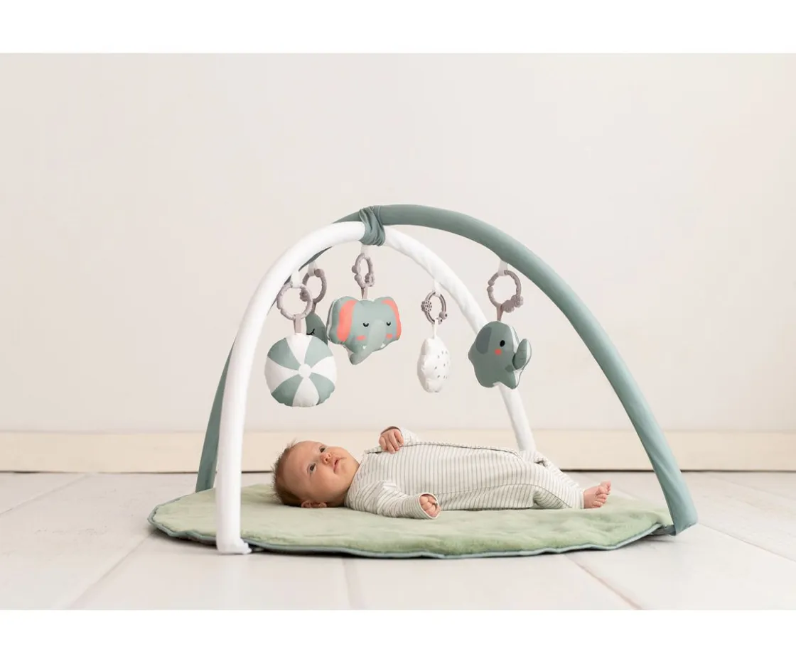 El gimnasio de actividades color Mint de Olmitos, incluye arcos y 5 juguetes sensoriales para acompañar a tu pequeño desde sus primeros días. Además de estimular el desarrollo motor, visual y cognitivo; también proporciona un espacio acogedor y seguro para el juego. Su base es antideslizante y a medida que el peque crezca, se puede retirar los arcos y juguetes para utilizar solamente como manta de actividades.