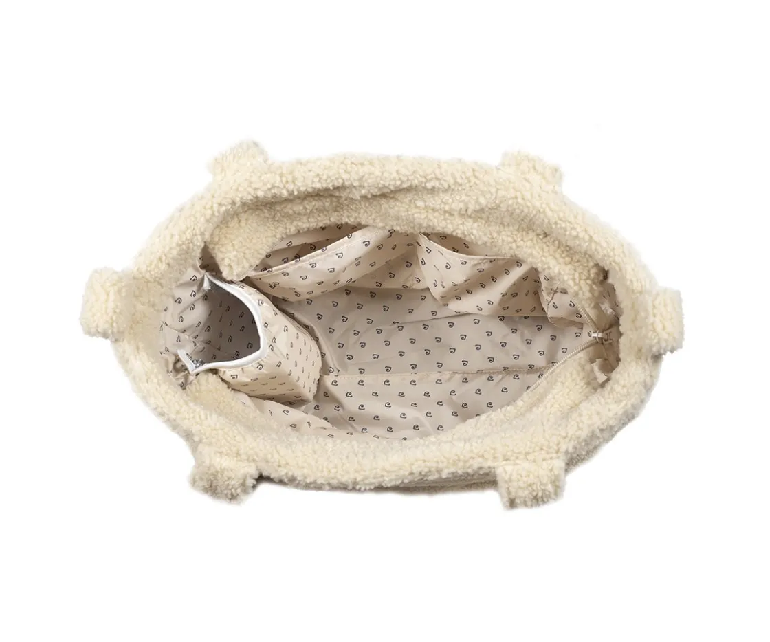 El bolso organizador o crossbody Paddington de Pasito a Pasito elaborado en borreguito beige, es un modelo muy ligero, resistente y espacioso para que puedas llevar todo lo que podrías necesitar durante el paseo de tu bebé.