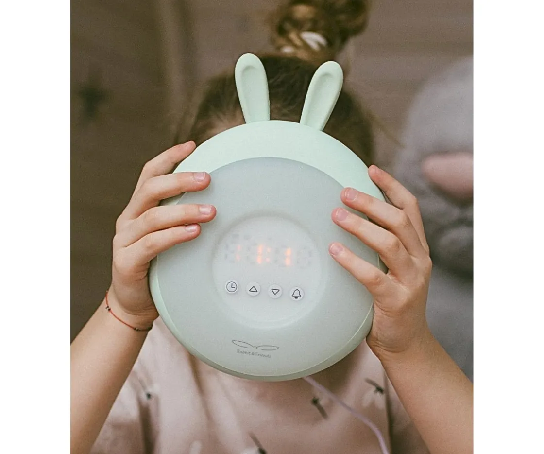 El reloj despertador con forma de conejito de Rabbit&Friends acompañará a los peques cada mañana en su despertar. Muestra la hora, es despertador y lámapara, cuya intensidad y color de luz puede cambiar.