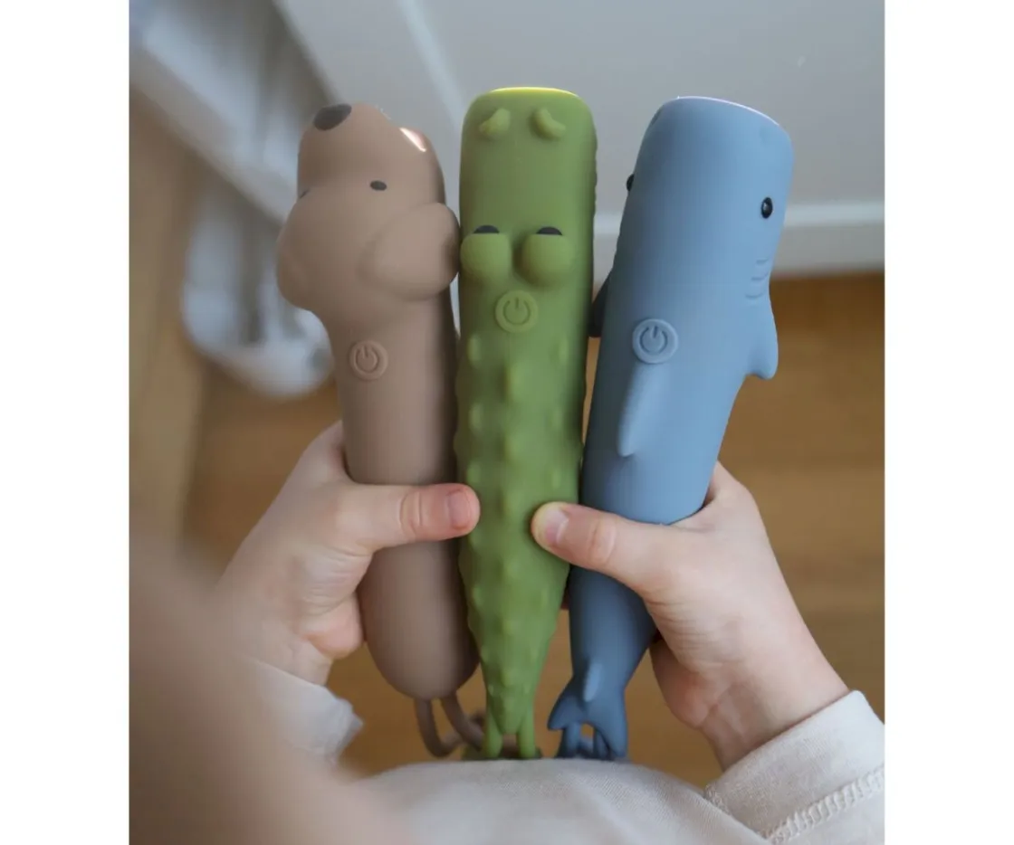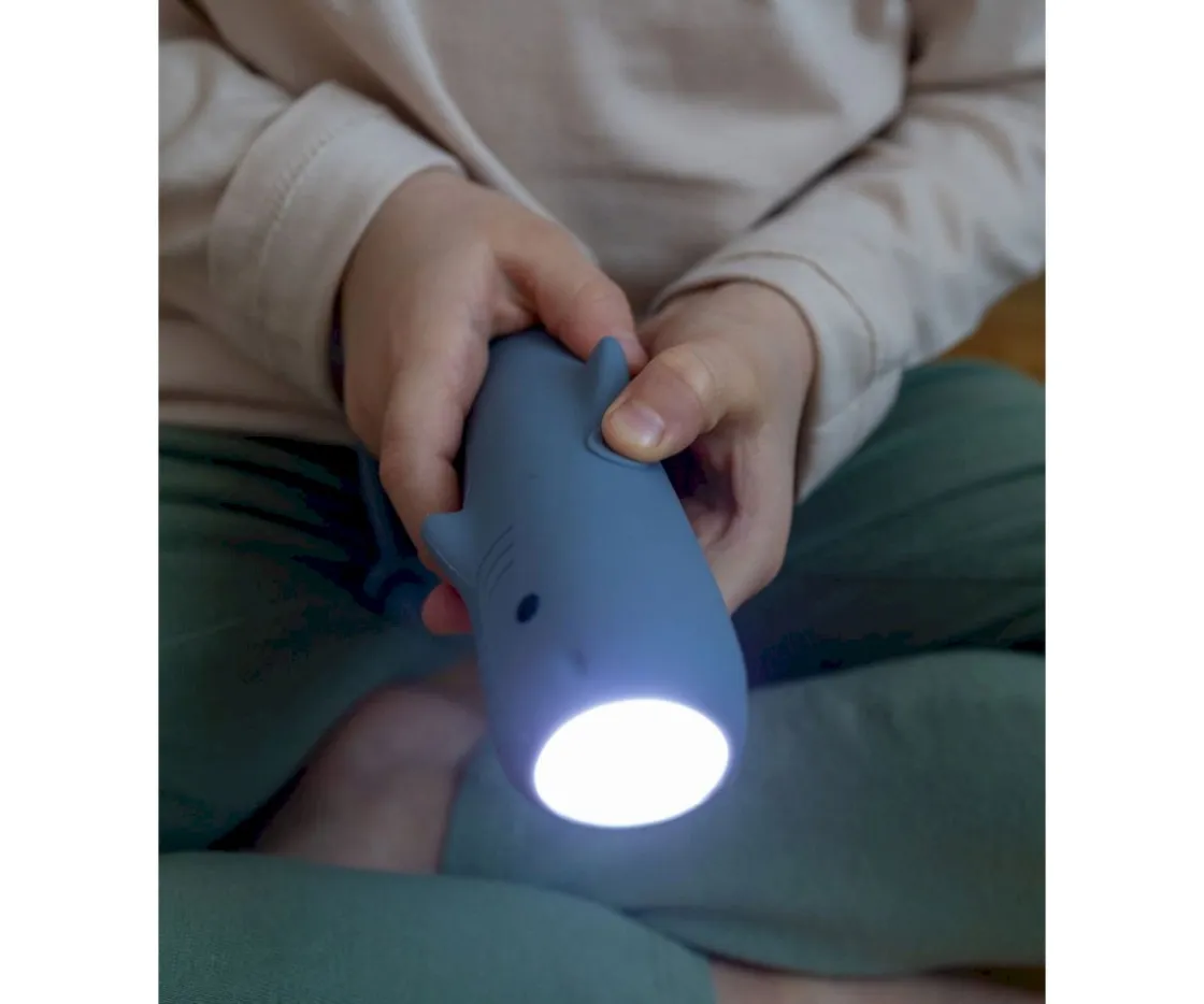 Original linterna recubierta de silicona suave con forma de tiburón que los peques podrán usar en aventuras nocturnas al aire libre, en juego de sombras en casa o para contar cuentos antes de dormir.
